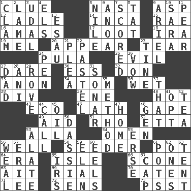 ACROSS 1. A slight indication 5. Political cartoonist Thomas 9. Cleo's killer 12. Dipping utensil 14. South American Indian 15. Actress Charlotte 16. Collect or gather 17. Plunder 18. Lyricist Gershwin 19. Cartoonist voice _ Blanc 20. Seem 23. Rend 24. Monetary unit of Botswana 25. Tending to cause great harm 27. Have the gumption 30. Curvy letter 32. Spanish title 33. Soon (poet.) 34. Tiny particle 36. Dripping 38. HTML Container Element 39. Compass dir. 40. Being at a high temperature 43. Environmental prefix 46. Thin strip of wood or metal 48. Yawn 49. Help 51. 17th letter of the Greek alphabet 52. Singer James 53. Silent film actress Nazimova 54. Sign of something about to happen 56. Not ill 58. Sowing specialist 61. Plant holder 64. Epoch 65. Small island 66. Biscuitlike quick bread 68. Small island 69. Monetary unit of Yemen 70. Consumed 71. Area sheltered from the wind 72. Elected reps. 73. Inconspicuous attention getter DOWN 1. Burrowing marine mollusk 2. Unable to walk 3. Freehold land 4. Raised railways 5. Mediterranean tributary 6. Small Philippine buffalo 7. Tallied 8. Make lace 9. Satellite of Uranus 10. "Two Mules for Sister ____" 11. Lightbulb-shaped fruit 13. Son of Isaac 21. Entreaty 22. Soft color 23. Prong on a fork 24. Animal enclosure 26. Solemn pledge 27. June honoree 28. Cuckoo 29. Be footloose 31. Echolocation 35. Mode 37. Not this but _ 41. Elect 42. Beverage made from leaves 44. Give a ring to 45. Lubricate 47. Residence 48. Commissioned mil. rank 50. Hyrax 53. Having winglike extensions 55. Celtic language 56. Welt 57. 4th largest of the Great Lakes 59. Enthusiasm 60. Snakelike fish 61. Plant holders 62. Washington bills 63. Portable shelter 65. Big collection agency 67. Head covering