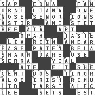 ACROSS 1. Plant excrement 4. Pulitzer Prize-winning author Ferber 8. Avid follower 11. Relating to the mouth 13. Woody, climbing, usually tropical plant 15. Single 16. Characteristic smell of wine 17. Sir (Sp.) 18. Charged atoms 19. Being in motion 21. Black tropical American cuckoo 22. Proofreading order 23. To sift 24. "One Day ___ Time" 27. Fitting 29. Brightly colored fish 30. Clothes sense 34. 54 in ancient Rome 36. It's straight from the horse's mouth 39. Approach 40. Relaxation 41. Eucharist need 43. Actor Lugosi 44. Excessive but superficial compliments 46. Have the gumption 47. Purpose 48. Spanish missionary in California 49. Small bottle 51. Had dinner 53. Connecticut Ivy Leaguer 54. A female animal or person 57. Penny 60. Two (Sp.) 63. Southeast Indonesia island 65. Medicinal plant 66. From or relating to Ireland 69. Tall New Zealand timber tree 70. Flaplike covering 71. Tarsus (plural) 72. Actor Baldwin 73. Area sheltered from the wind 74. Puts into a specified state 75. Eastern Standard Time (abbr.) DOWN 1. Echolocation 2. Came up 3. Thick mixture 4. Raised railways 5. Expire 6. Nanny 7. Soon (poet.) 8. 12 inches 9. Queen of England 1702-14 10. A home for chicks 12. Flowery wreath 14. Operatic vocal solo 18. Byzantium, centuries later 20. Strike 25. Canvas cover 26. Forward in time 28. Parent Teacher Assoc. 29. Make much ado about nothing 31. Observes 32. Falsehood 33. Period 34. Unable to walk 35. Austrian river, tributary to the Danube 37. Call ___ day 38. Impudent aggressiveness 40. Curvy letter 42. Famous astronaut Armstrong 45. Floor protector 50. Small island 52. Prepare for publication 54. Grin 55. Residences 56. Spew [out] 57. Give a ring to 58. Writer Wiesel 59. Thickened enlargement 61. Mouths or openings 62. Male parent of an animal 64. Retirement account (abbr.) 67. Fast jet (abbr.) 68. Part of HMS, perhaps