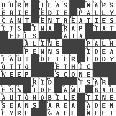 ACROSS 1. Dormintory (informal) 5. Afternoon social gatherings 9. Atlas contents 13. 4th largest of the Great Lakes 14. Singer Brickell 15. Chummy 16. Patter 17. Pleas 19. It is 20. _ tizzy (2 wds.) 21. Reproach for some lapse or misdeed 22. Make lace 23. Snakelike fish 25. _ moment's notice (2 wds.) 26. Place in a line 30. Inside of hand 34. Actor Sean's family 35. It may be bright or harebrained 36. Drawn tight 39. Prevent from occurring 42. Whirlpool 43. Von Bismarck 44. Principle of right and wrong 46. Shed a tear 47. Biscuitlike quick bread 48. To free from 51. Russian ruler of old 54. Double-curved letter 57. Binary compound 58. Leather borer 60. Drinking establishment 62. Car 65. Prong on a fork 66. Actors Connery and Penn 67. Type of rug 68. Arabian gulf 69. Jane of fiction 70. Highlander 71. Confront DOWN 1. Tenth: prefix 2. Declaim 3. Wash lightly 4. Was introduced to 5. Adolescent 6. Pulitzer Prize-winning author Ferber 7. Small island 8. Spanish missionary in California 9. Floor protector 10. Came down and settled, as after flight 11. Entreaty 12. System (abbr.) 15. Dad 18. Consume 20. Capri or Wight 24. Portable computer 27. Working for oneself (abbr.) 28. Compass dir. 29. _____ Park, CO 30. Parts 31. Find the sum of 32. Directed 33. Can I? 36. Pull behind 37. Had dinner 38. Shoshoni 40. And so on (abbr.) 41. 17th letter of the Greek alphabet 45. International (abbr.) 48. Basketball hoops 49. Wedding promise 50. Debunk (Brit. slang) 52. Tolerate 53. The wife of a rajah (variant) 54. Comfort 55. Chop _ 56. Play the lead 58. Toward shelter 59. Welt 61. Monthly bill 63. Single 64. Retirement account (abbr.) 65. Scottish cap