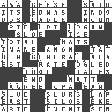 ACROSS 1. White ___ sheet 4. Honkers 9. Expressed in words 13. It is 14. Ferber et al. 15. Southeast Asian peninsula 16. Two (Sp.) 17. Dipping utensil 18. Part of speech 19. Sliced dessert 21. Car dealer's back yard 22. Utah city north of Ogden 24. _ gin 26. Frozen water 27. "_____ Recall" 29. Floor coverings 30. Empty; void 31. Soon (poet.) 33. Make lace 36. Lair 37. Commissioned military rank 40. In the manner of 41. Eastern Standard Time (abbr.) 42. Assign a rank or rating to 43. Stared at amorously 45. Implement 47. Stories 48. Conclusion 49. Electrical Unit 50. Match 52. Tax preparer (abbr.) 54. Ewer handle 56. Change direction abruptly 57. Plays smoothly or legato 59. Infant locale 61. 90 degrees 62. Grain storage towers 63. Make supply last 64. Johnson of "Laugh-In" 65. Happening 66. Elected rep. DOWN 1. Assist 2. Cease 3. Helper 4. Set 5. Peak District village in England 6. Inside; within (prefix) 7. Table seasoning 8. Compass dir. 9. Scorches 10. Small Philippine buffalo 11. Goddess of spring and wife of Bragi 12. Spanish title 20. Flair 22. Climbing, woody, usually tropical vines 23. Sep. follower 25. Cassini of fashion 27. Event that recurs at intervals 28. Singles 29. Greater amount 31. Of or related to the anus 32. Fish or hair follower 33. Baron Munchausen's specialties 34. Toward shelter 35. Small amounts or degrees 38. Eat (away) 39. Globular water bottle used in Asia 44. Yard entry 45. Cylindrical with tapered ends 46. Single 49. Make _____ (do battle with) 50. Having or resembling wings 51. Abrupt rush of wind 52. 154 in Roman numerals 53. Whine 55. Libertine 56. Ocean 57. Compass dir. 58. Fast jet (abbr.) 60. Fenced enclosure