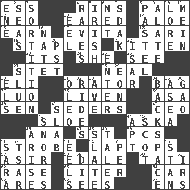 ACROSS 1. Double-curved letter 4. Basketball hoops 8. Inside of hand 12. Modern: prefix 13. Having ears or earlike features 14. _ vera 15. Merit 17. Webber/Rice musical 18. Indian skirt 19. Paper fasteners 21. Baby cat 23. ___ a Wonderful Life 24. A female animal or person 26. Perceive with the eye 27. Proofreading order 28. Actress Patricia 30. Biblical high priest 31. Speaker 34. Paper or plastic container 37. Nilotic language 38. Make or become more lively 39. White ___ sheet 40. Elected rep. 41. Spring feasts 42. Corporate head (abbr.) 43. _ gin 44. "____ silly question..." 46. Santa ___, CA 47. Fast jet (abbr.) 50. Personal Computers (abbr.) 51. Disco prop 54. Portable computers 57. SW Saudi Arabia district 58. Peak District village in England 60. Jacques of French films 62. Raze (variant) 63. 61 cubic inches 64. Automobile 65. Ancient Greek god of war 66. Observes 67. Followers of ems DOWN 1. Compass dir. 2. Oceans 3. Conclusion 4. All-night dance parties 5. From or relating to Ireland 6. Was introduced to 7. Neighbor of Neb. 8. Soft color 9. Having winglike extensions 10. Old wives' tales, e.g. 11. Chow _ 13. Snakelike fish 16. Nathan's nickname 20. Pacific Standard Time (abbr.) 22. Austrian river, tributary to the Danube 25. Keyboard key 27. Change direction abruptly 29. Immeasurably long periods of time 30. Raised railways 31. Butter sub 32. Amusement-park features 33. "___ Maria" 34. Keyboard key 35. Toward the sea 36. E Mali city 41. Thick slice 43. Sounds asleep 44. Fitting 45. Highlander 46. Originate 48. Chalkboard 49. Falsehoods 51. "Two Mules for Sister ____" 52. Russian ruler of old 53. Snakelike fish 55. For each 56. Comedian Laurel of Laurel & Hardy 59. Pass on 61. Big collection agency
