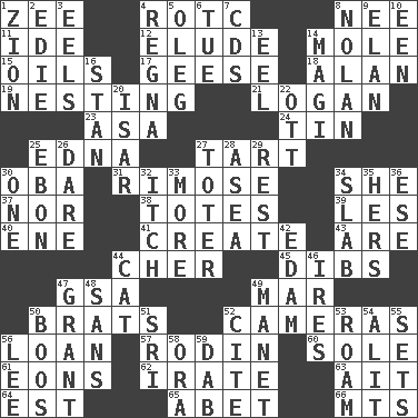 ACROSS 1. Last letter of the English alphabet 4. College mil. group 8. Born 11. Binary compound 12. Evade 14. Undercover agent 15. Lubricates 17. Honkers 18. ____ Jay Lerner 19. Snuggling 21. Utah city north of Ogden 23. White ___ sheet 24. Shallow baking pan 25. Pulitzer Prize-winning author Ferber 27. Small pie 30. Chief or king in Benin or Nigeria 31. Full of chinks, cracks, or crevices 34. A female animal or person 37. And not 38. Hauls 39. French article 40. Compass dir. 41. Make 43. "We ___ not amused" (Victoria) 44. "Mermaids" star 45. Rights 47. Girls' org. (abbr.) 49. Spoil 50. Naughty children 52. Devices for capturing images 56. Grant temporary use of 57. "The Thinker" sculptor 60. Not divided or shared with others 61. Immeasurably long periods of time 62. Feeling or showing extreme anger 63. Small island 64. Eastern Standard Time (abbr.) 65. Collude with 66. Mountains (abbr.) DOWN 1. The Jewish people; Israel 2. Singer Brickell 3. Snakelike fish 4. Canadian anthropologist Darnell 5. Cassini of fashion 6. Third day of the wk. 7. Music discs 8. Pitcher Ryan 9. Style 10. Car or cant ending 13. Snakelike fish 14. Wise men 16. Comedian Laurel of Laurel & Hardy 20. Austrian river, tributary to the Danube 22. Baseball player Mel 25. Inky black, to poets 26. Have the gumption 27. Carrier 28. Toward the sea 29. Respite 30. Single 32. Hankering 33. Greater amount 34. Broad, flat, thick piece 35. Possessive pronoun 36. Compass dir. 42. Dutch treat 44. Feline 46. Angers 47. Let have 48. Without 49. French painter Edouard 50. Scornful sounds 51. _ Lanka 52. Quote 53. Wander 54. Set down 55. Puts into a specified state 56. Area sheltered from the wind 58. Mouth or opening 59. Apply (a substance) by light strokes
