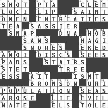 ACROSS 1. Attempt 5. Parent Teacher Assoc. 8. To starve (Brit.) 12. Venues 13. Mouth edge 14. Virtuous person 15. Sign of something about to happen 16. Pleas 19. Beverage made from leaves 20. More lively and spirited 21. Fastener 23. Heredity factor (abbr.) 24. Crowd into 27. Without 30. Wise men 31. Sounds asleep 34. Supplemented with great effort 35. Mine, in Marseilles 38. Plates 40. Observes 41. Groovy apts. 42. Flight of steps 44. Proofreading order 45. Relationship diagram 46. Double-curved letter 47. Small island 50. Is not 53. "Death Wish" actor 57. RI univ. 59. Census information 63. Oceans 64. Came up 65. Whopper 66. Tending to cause great harm 67. Nathan's nickname 68. Raised railways 69. Lacquered or enameled metalware DOWN 1. Groove 2. Residences 3. Sea 4. Metal container 5. Entreaty 6. Airtight sealed metal containers 7. Tenement units (abbr.) 8. Domesticated feline 9. Cards in a Roman deck? 10. Compass dir. 11. Mountains (abbr.) 14. "Two Mules for Sister ____" 17. To free from 18. Car or cant ending 20. Connect, as a bridge 22. Aid 24. Create 25. Double curve, resembling the letter S 26. Auction offers 28. Lower and raise head in agreement 29. Indian titles of respect 30. Makes clutter 32. Eastern Standard Time (abbr.) 33. Scram! 35. Domed church section 36. Floor protectors 37. Lyric poems 39. Title for a knight 43. It's straight from the horse's mouth 47. Competent 48. Lyricist Gershwin 49. Small child 51. New (sp.) 52. Lag or linger behind 54. Mediterranean tributary 55. Earth 56. Singles 58. Small island 59. Baking dish 60. Mouth or opening 61. Plant holder 62. Purpose 63. Put into a specified state
