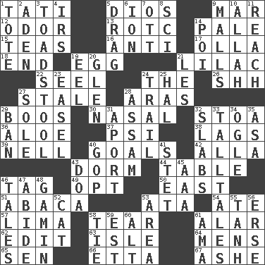 ACROSS 1. Jacques of French films 5. "Vaya con ____" 9. Impair 12. Aroma 13. College mil. group 14. Diluted with white 15. Afternoon social gatherings 16. Against 17. Spanish pot 18. Conclusion 19. Oval reproductive body of a fowl 21. Pale purple color 22. Sew up the eyelids of hawks and falcons 24. Definite Article 26. Quiet! 27. Lacking originality or spontaneity 28. Caspian sea tributary 29. Scornful sounds 30. Rhinal 32. Portico 36. Medicinal plant 37. 23rd letter of the Greek alphabet 38. Falls behind 39. 1994 drama film starring Jodie Foster 40. Purposes of endeavors 42. Silent film actress Nazimova 43. Dormintory (informal) 44. Eating place 46. Label 49. Elect 50. 90 degrees 51. Phillipine bananalike plant 53. "One Day ___ Time" 54. Had dinner 57. Pale green bean 58. Separate forcefully 61. Having or resembling wings 62. Prepare for publication 63. Capri or Wight 64. Not women's 65. Elected rep. 66. Singer James 67. American tennis player Robert DOWN 1. Lug 2. An important port of Yemen 3. Inedible or poisonous agaric 4. Big collection agency 5. To draw with force 6. Electrically charged atom 7. Baseball player Mel 8. _-fi 9. Promenades 10. Assad's deity 11. Arrive at 14. Luau course 19. Snakelike fish 20. Small, secluded valley 21. French article 23. Artist's stand 24. Drop behind 25. Actor Linden 27. Flatfish 28. Indian state 29. Prohibit 31. To the left, to Queeg 32. Thick slices 33. Baron Munchausen's specialties 34. Stare at amorously 35. White ___ sheet 40. Grand Old Party 41. Proofreading order 43. ___ good deed 45. Auto club (abbr.) 46. Falsehoods 47. Remain 48. Homeless child 52. Domesticated feline 53. Length times width 55. Hyperbolic tangent 56. Celtic language 58. Make a knot 59. Eastern Standard Time (abbr.) 60. Keyboard modifier key 61. Housemaid (var.)