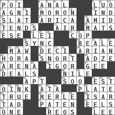 ACROSS 1. Luau course 4. Of or related to the anus 8. Nilotic language 11. Hindu god of fire 13. Person of subnormal intelligence 15. Working for oneself (abbr.) 16. Narrow board 17. N. Chile seaport 18. Among 19. Looks after 21. Wind 22. Floor protectors 23. Compass dir. 24. Luau accessory 27. Police officer (slang) 29. Synchronize (abbr.) 30. Calif. Air Force Base 34. Opening into something insatiable 36. Tenth: prefix 39. Believer in; advocate of (suffix) 40. Israeli folk dance 41. Derisive sound 43. Edge tool used to cut and shape wood 44. Sports stadium 46. Composer Stravinsky 47. Turn to the right 48. Allots cards 49. The longest river in the world 51. Fitting 53. "Barney Miller" actor Jack 54. Eastern Standard Time (abbr.) 57. Pig sound 60. _ moment's notice (2 wds.) 63. Food holder 65. Loyal 66. Haggard of country music 69. Austrian river, tributary to the Danube 70. Small amount or degree 71. Eucharist need 72. Snakelike fish 73. Single 74. Vintage cars 75. Area sheltered from the wind DOWN 1. Thick mixture 2. Stares at amorously 3. Empty; void 4. Nursemaid (var.) 5. Not either 6. Operatic vocal solo 7. Venues 8. Pale green bean 9. A single undivided whole 10. Probability 12. It would 14. Drug cop 18. Electrical Measurement 20. Mischievous 25. Conclusions 26. Ancient Celtic tribe of eastern Britain 28. Chief or king in Benin or Nigeria 29. Tchaikovsky ballet 31. Assistant 32. Goldbrick 33. Compass dir. 34. Greater amount 35. Type of rug 37. Gear tooth 38. Removes the wrinkles 40. Possessed 42. Musical group of three 45. Viper 50. Trim (branches) 52. Pack (down) 54. Artist's stand 55. Having lost freshness 56. Laconic 57. "Beetle Bailey" pooch 58. SW Asia republic 59. Unadorned 61. Separate forcefully 62. Johnson of "Laugh-In" 64. Falsehood 67. Lion 68. Followers of ems