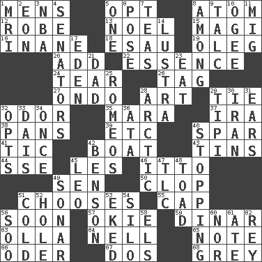 ACROSS 1. Not women's 5. Choose 8. Smallest unit of an element 12. Loose flowing garment 13. Christmas carol 15. Wise men 16. Silly 18. He sold his birthright 19. Cassini of fashion 20. Say or write further 22. Center 24. Lacerate 26. Label 27. Southwest Nigerian state 28. Tate display 29. Neckwear 32. Aroma 35. Hindu Mythology: god of death 37. Lyricist Gershwin 38. Baking dishes 39. And so on (abbr.) 40. Practice fight 41. Nervous spasm 42. Water vessel 43. Airtight sealed metal containers 44. Compass dir. 45. French article 46. "Tell ____ the Marines!" 49. Elected rep. 50. Hoof sound 51. Opts 55. Head covering 56. Within a short period 57. Migrant worker of the '30s 59. Middle Eastern gold or silver currency 63. Rounded earthenware pot or jar 64. 1994 drama film starring Jodie Foster 65. Brief written record 66. River in Europe 67. Two (Sp.) 68. Jennifer or Joel DOWN 1. Medical imaging device (abbr.) 2. A really long time 3. Basketball assoc. 4. Legislators 5. Single 6. Introduce or present, as a question 7. Beverages made from leaves 8. Amid 9. Baby powder 10. Double curve, resembling the letter S 11. Russian fighter aircraft 14. A period of five years 17. Paradise 21. Male parent 23. Erode 25. Lover boys 28. Northern region 29. Native american tent (variation) 30. SW Asia republic 31. Hearing organs 32. Elects 33. Raised platform 34. Single time 36. "One Day ___ Time" 40. Closing up, plugging up 42. Gillaume's butler role 45. Lion 47. Affectionate concern, for short 48. Frog relative 49. Underwater navigation system 51. Having a low temperature 52. Opening into or through something 53. Supplemented with great effort 54. Grain storage tower 56. "Barney Miller" actor Jack 58. Raised railways 60. Or not 61. Had dinner 62. Marina Del _, California