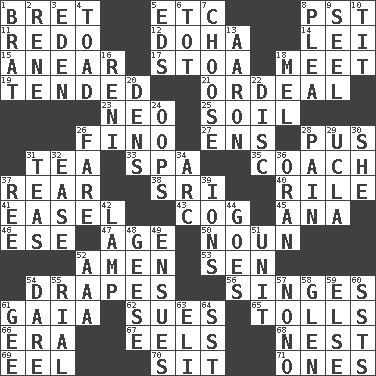 ACROSS 1. Cy Young winner Saberhagen 5. And so on (abbr.) 8. Pacific Standard Time (abbr.) 11. Make new 12. Capital of the state of Qatar 14. Flowery wreath 15. Approach 17. Portico 18. Rendezvous 19. Watched over 21. Severe or trying experience 23. Modern: prefix 25. Land 26. A pale, very dry sherry 27. Followers of ems 28. Purulenc 31. Beverage made from leaves 33. Health resort 35. Team commander 37. Tail end 38. Indian title of respect (Mr.) 40. Cause heat under the collar 41. Artist's stand 43. Gear tooth 45. Santa ___, CA 46. Compass dir. 47. Personal question 50. Part of speech 52. So be it 53. Elected rep. 54. Window treatments 56. Burns superficially 61. Greek goddess of the earth (variant) 62. Takes to court 65. For Whom the Bell _____ 66. Epoch 67. Snakelike fish 68. Egg locale 69. Snakelike fish 70. Be seated 71. Washington bills DOWN 1. Naughty child 2. French philosopher Descartes 3. Locale of original sin 4. Frog relative 5. Begley and Asner 6. Small child 7. Opt 8. Entreaty 9. Stitch closed the eyes of (a falcon) 10. Teat (slang) 13. Composer Copland 16. Painter Guido (1575-1642) 18. Cartoonist voice _ Blanc 20. Cub Scout units 22. Flat circle 24. I made a mistake 26. Conductor's collection 28. Ache 29. Southern CA. univ. 30. A female animal or person 31. Afternoon social gatherings 32. Comfort 34. Curve 36. NW Algerian seaport 37. To separate or throw off 39. Charged particles 42. Desk light 44. Leaves 48. Honkers 49. Takes place subsequently 51. A single undivided whole 52. Auto club (abbr.) 54. Have the gumption 55. Monetary unit of Yemen 57. Words to Nanette 58. Small, secluded valley 59. Otherwise 60. Fast planes 61. Unit of force equal to gravity 63. Connecticut Ivy Leaguer 64. Fast jet (abbr.)