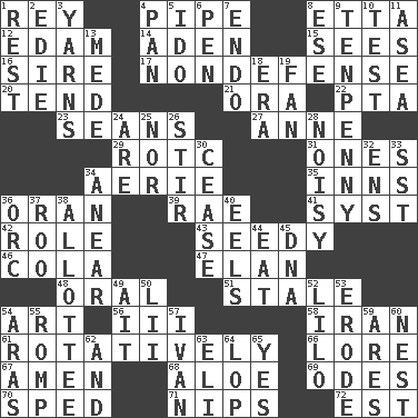 ACROSS 1. Marina Del _, California 4. Corncob 8. Singer James 12. Dutch treat 14. An important port of Yemen 15. Perceives with the eye 16. Father 17. Unrelated to defense, as in spending 20. Watch over 21. Mouth or opening 22. Parent Teacher Association (abbr.) 23. Actors Connery and Penn 27. Singer Murray 29. College mil. group 31. Singles 34. Nest on high 35. Taverns 36. NW Algerian seaport 39. Actress Charlotte 41. System (abbr.) 42. Hero or heavy, e.g. 43. Full of seeds 46. Root beer relative 47. Style 48. Of the mouth 51. Lacking originality or spontaneity 54. Nonscientific branch of learning 56. One more than two 58. SW Asia republic 61. Rotating or pertaining to rotation 66. Old wives' tales, e.g. 67. So be it 68. _ vera 69. Lyric poems 70. Moved rapidly 71. Cuts off 72. Eastern Standard Time (abbr.) DOWN 1. Repose 2. Singer Brickell 3. Tall tales 4. Baking dish 5. Wedding promise 6. Fenced enclosure 7. Inside; within (prefix) 8. Compass dir. 9. 3-inch nail 10. Trial 11. At sea 13. Ancient Persian 18. Period 19. Air blower 24. "We ___ not amused" (Victoria) 25. And not 26. Use a spoon 28. Annoyingly loud 30. Stop 32. Followers of ems 33. Fast jet (abbr.) 34. Approach 36. The grampus (Milton) 37. Friend of Pooh 38. One to whom something is allotted 40. Snakelike fish 44. Erode 45. Heredity factor (abbr.) 49. Small island 50. Cards in a Roman deck? 52. _ and Stitch 53. Wear away 54. Caspian sea tributary 55. Play 57. _ the terrible 59. Ancient Greek god of war 60. A home for chicks 62. Also 63. Connecticut Ivy Leaguer 64. Chop off 65. Affirmative reply