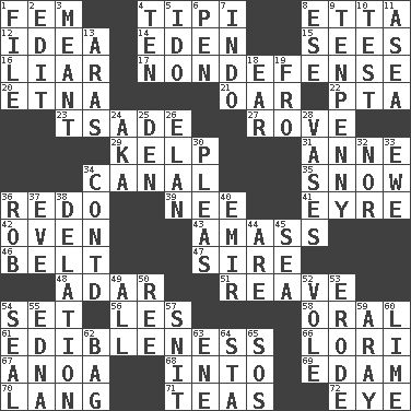 ACROSS 1. Opposite of masc. 4. Native american tent (variation) 8. Singer James 12. The main thing one is thinking about 14. Paradise 15. Perceives with the eye 16. One who doesn't tell the truth 17. Unrelated to defense, as in spending 20. Inactive volcano in Sicily 21. Rowing implement 22. Parent Teacher Association (abbr.) 23. Sadhe (variant) 27. Be footloose 29. Seaweed 31. Queen of England 1702-14 34. Lessep's creation 35. Overwhelm 36. Make new 39. Born 41. Jane of fiction 42. Baking chamber 43. Collect or gather 46. Waist strap 47. The founder of a family 48. The sixth month of the Jewish calendar 51. Rob, plunder, or pillage 54. Put into a specified state 56. French article 58. Taken by mouth 61. The property of being fit to eat 66. Australian parrot (variant) 67. Small Philippine buffalo 68. To the inside or interior of 69. Dutch treat 70. Long (Scottish) 71. Beverages made from leaves 72. Sight organ DOWN 1. Do some clerical work 2. Prepare for publication 3. Intended 4. Nine, plus one 5. Wedding promise 6. Writing instrument 7. _ china 8. Compass dir. 9. 3-inch nail 10. Trial 11. At sea 13. Caspian sea tributary 18. Ewer handle 19. From 24. Alias (abbr.) 25. Lair 26. Flair 28. Flower holders 30. Entreaties 32. Or not 33. She-sheep 34. Continued (abbr.) 36. Director Reiner 37. First lady 38. Accusation by an informer 40. Independent ruler or chieftain 44. "We ___ not amused" (Victoria) 45. Ocean 49. Everything 50. To sift 52. Short-tailed, large-bodied rat 53. Wear away 54. Lick closed 55. Pulitzer Prize-winning author Ferber 57. In a ____ (agitated or irritated) 59. Like ___ of sunshine 60. Citrus frut 62. Container for groceries 63. Compass dir. 64. R.R. building 65. Distress signal