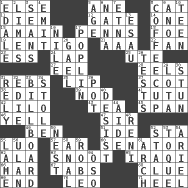 ACROSS 1. Otherwise 5. A saturated hydrocarbon 8. Domesticated feline 11. South Vietnam president (1954) 12. Yard entry 14. Single 15. With great haste 17. Actor Sean's family 18. Enemy 19. Small, flat, pigmented spot on the skin 21. Auto club (abbr.) 22. Air blower 23. Curvy letter 24. Pet locale 25. Shoshoni 27. Snakelike fish 28. Snakelike fish 31. Confederate soldiers (slang) 35. Mouth edge 37. Native of Scotland 38. Prepare for publication 39. Lower and raise head in agreement 41. Ballerina skirt 42. _ and Stitch 43. Afternoon social gathering 45. Connect, as a bridge 46. Shout 47. Title for a knight 49. Benjamin's nick name 51. Binary compound 52. R.R. building 55. Nilotic language 57. Ewer handle 60. Elected representative 62. In the manner of 63. Snout, nose 65. Resident of Iraq 66. Third mo. 67. Bar bills 68. A slight indication 69. Conclude 70. Lion 71. The bottom of a shoe or boot DOWN 1. Peak District village in England 2. Citrus fruits 3. Seines 4. Send forth 5. Grow older 6. Nanny 7. Inactive volcano in Sicily 8. Java holder (2 wds.) 9. Small Philippine buffalo 10. Adolescent 13. Son of Isaac 16. Mediterranean tributary 17. Cotton for raincoats, e.g. 20. Highlander 26. Trials 29. Globular water bottle used in Asia 30. Surprise greatly 31. Have confidence or faith in 32. Singer Brickell 33. Big road sign 34. Took without asking 36. Plant holder 40. Cease 44. Assistant 48. Painter Guido (1575-1642) 50. A home for chicks 52. Showing deterioration from age 53. Woman's close-fitting hat 54. Satellite of Uranus 55. Unable to walk 56. ____ Bator, Mongolia 58. Of or related to the anus 59. Loose flowing garment 61. Bowlike part 64. Bear (Spanish)