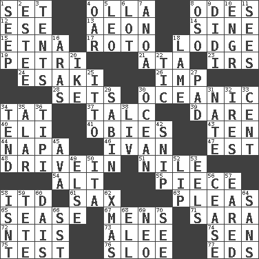 ACROSS 1. Put into a specified state 4. Water jar 8. Lyric poems 12. Compass dir. 13. Period of immesurable duration 14. Trig term 15. Inactive volcano in Sicily 17. Printing process, for short 18. Inn 19. _ dish (used to culture cells) 21. "One Day ___ Time" 23. Big collection agency 24. 1973 Nobel Price Winner (Physics) Leo 26. Naughty child 28. Arranges properly for use 30. Pertaining to the sea 34. Make lace 37. Baby powder 39. Have the gumption 40. Biblical high priest 41. Off-Broadway awards 43. Nine, plus one 44. California wine valley 46. "Terrible" tsar 47. Eastern Standard Time (abbr.) 48. Popular '50s hangout 51. "Death on the ____" 54. The first octave above the treble staff 55. Component 58. It would 61. Saxophone 63. Entreaties 65. Gospel singer Marvin 67. Not women's 71. "Two Mules for Sister ____" 72. Nuclear Threat Initiatives 73. Toward shelter 74. Elected rep. 75. Trial 76. A type of plum 77. Begley and Asner DOWN 1. Ooze 2. First name in cosmetics 3. Portable shelters 4. Boat paddle 5. Lion 6. Car dealer's back yard 7. Small Philippine buffalo 8. Bear (Spanish) 9. "You Light Up My Life" star Conn 10. Engineer (abbr.) 11. Observes 16. Ancient river in northeast Turkey 18. Unable to walk 20. D.D.E's nickname 22. Nervous spasm 25. "Tell ____ the Marines!" 27. Writing tablet 29. Unit of acoustic absorption 30. Sea 31. Nathan's nickname 32. Angers 33. Penny 34. Be inclined (to) 35. Having or resembling wings 36. Native american tent (variation) 38. 54 in ancient Rome 42. Clip 45. Actress Gardner 49. Otherwise 50. Call ___ day 52. Mouth edge 53. Snakelike fish 56. Stop 57. Having ears or earlike features 58. Is not 59. Wig 60. Raised platform 62. Dec. holiday 64. Without 66. Fast jet (abbr.) 68. Pipe bend 69. Modern: prefix 70. Observe