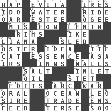 ACROSS 1. Hit sharply and swiftly 4. Webber/Rice musical 9. Angers 13. Wedding promise 14. Wetness 15. Travel on or in a vehicle 16. Boat paddle 17. First name in cosmetics 18. Double curve, resembling the letter S 19. Mountains (abbr.) 21. Period of immesurable duration 22. Soviet premier 1918-24 24. Basketball hoops 26. Mamie's husband 27. Woody, climbing, usually tropical plant 29. Downhill vehicle 30. Flexible twig of a willow tree 31. It may be bright or harebrained 33. Neckwear 36. Feline 37. Center 40. White ___ sheet 41. Big collection agency 42. Lodging establishments 43. Shopping centers 45. Table seasoning 47. An arm off of a larger body of water 48. Petroleum 49. Proofreading order 50. Proofreads 52. Curve 54. Armed conflict 56. Spoken 57. Sea 59. Lion 61. Male parent of an animal 62. Swap 63. Followers of ems 64. Nourish 65. Laconic 66. "Barney Miller" actor Jack DOWN 1. _ de Janeiro 2. First of billions? 3. Likenesses of persons 4. She-sheep 5. Flower holders 6. "Tell ____ the Marines!" 7. Adolescent 8. "We ___ not amused" (Victoria) 9. Pressed 10. Swiss mountan, "Queen of the Mountains" 11. Locale of original sin 12. Perceive with the eye 20. Trig term 22. Pale purple color 23. Supplement with great effort 25. Female horse 27. Event scenes 28. Austrian river, tributary to the Danube 29. Elected reps. 31. Is not 32. Lair 33. Baron Munchausen's specialties 34. Capri or Wight 35. 90 degrees 38. Beverly of Met fame 39. Give off 44. Afresh 45. Dirtied 46. Small island 49. Tons 50. 4th largest of the Great Lakes 51. Have the gumption 52. Land measure 53. Rump 55. Former U.S. Attorney General Janet 56. Order of Saint Francis (abbr.) 57. Baseball player Mel 58. Born 60. Bear (Spanish)