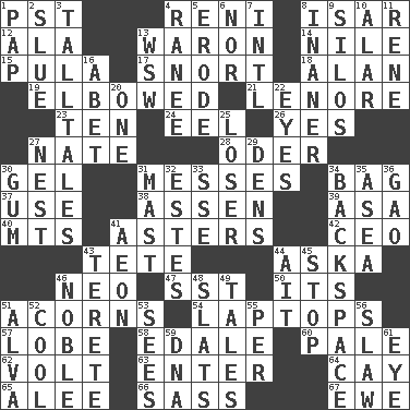ACROSS 1. Pacific Standard Time (abbr.) 4. Painter Guido (1575-1642) 8. Austrian river, tributary to the Danube 12. Insect wing 13. Make _____ (do battle with) 14. The longest river in the world 15. Monetary unit of Botswana 17. Derisive sound 18. Actor Alda or Thicke 19. Turned at an angle; bent 21. Poe poem 23. Nine, plus one 24. Snakelike fish 26. It is so 27. Nathan's nickname 28. Baltic tributary 30. Set 31. Makes clutter 34. Paper or plastic container 37. Purpose 38. NE Netherlands city 39. White ___ sheet 40. Mountains (abbr.) 41. Michaelmas daisies 42. Corporate head (abbr.) 43. Wig 44. "____ silly question..." 46. Modern: prefix 47. Fast jet (abbr.) 50. ___ a Wonderful Life 51. Oak nuts 54. Portable computers 57. Ear part 58. Peak District village in England 60. Light colored 62. Electrical Unit 63. Keyboard key 64. Island 65. Toward shelter 66. Backtalk 67. She-sheep DOWN 1. Infant food 2. Turn sharply 3. Baron Munchausen's specialties 4. The wife of a rajah (variant) 5. Wear away 6. And not 7. International (abbr.) 8. More empty; more void 9. Grain storage towers 10. Having or resembling wings 11. French philosopher Descartes 13. Compass dir. 16. Collude with 20. Single 22. Snake ____ (dice throw) 25. Failure 27. A home for chicks 29. Lairs 30. Chewing product 31. Vertical spar for supporting sails 32. _____ Park, CO 33. Compass dir. 34. Keyboard key 35. Toward the sea 36. E Mali city 41. Age 43. Cigar-shaped 44. Small island 45. Constrict 46. Impressive in appearance 48. Narrow boards 49. Falsehoods 51. Inventor's middle name 52. Calm and collected 53. Observes 55. For each 56. Cole _ (cabbage dish) 59. Heredity factor (abbr.) 61. Sight organ