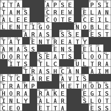 ACROSS 1. Call ___ day 4. Domed church section 8. 23rd letter of the Greek alphabet 11. Scottish caps 13. Ship's personnel 14. Enthusiasm 15. Toward shelter 16. ____ d'Azur (French Riviera) 17. To provide with a ceiling 18. Small, flat, pigmented spot on the skin 21. Impressive in appearance 22. Caspian sea tributary 23. Compass dir. 25. Eastern Standard Time (abbr.) 26. Make lace 29. Plea 32. Collect or gather 34. Followers of ems 35. Pipe bend 38. Dinghy 39. Theater features 41. Plunder 43. ___ a Wonderful Life 44. Affectionate concern, for short 45. Extremist 46. File 13 50. Direct toward a target or goal 51. And so on (abbr.) 54. "We ___ not amused" (Victoria) 55. Deliberation 57. _____ steamer (cargo ship) 59. Modes 63. Israeli folk dance 64. Libertine 67. Armor plate that protects the chest 68. Inwardly 69. Having or resembling wings 70. Groove 71. Corporate head (abbr.) 72. Singer James 73. Double-curved letter DOWN 1. Slanted text style (abbr.) 2. Lie 3. So be it 4. Buttonhole 5. Adept person 6. Arrange properly for use 7. She-sheep 8. Military trainee 9. Moves on water 10. An arm off of a larger body of water 12. Stalk of a moss capsule 14. Environmental prefix 19. Angers 20. Separate the seeds from cotton 21. Fish or hair follower 23. Posted 24. Backtalk 26. Small boy 27. Mine, in Marseilles 28. Small pie 30. Arrive at 31. Shout 33. System (abbr.) 36. Globular water bottle used in Asia 37. Australian parrot (variant) 39. Play the lead 40. Otherwise 42. Scottish cap 45. A single undivided whole 47. Reproach for some lapse or misdeed 48. Device for capturing images 49. "___ Maria" 51. Value system 52. Heavy duty weighing machine 53. Monte _, Las Vegas Hotel/Casino 56. "______ My Girl" (Turtles hit) 58. Fifth month 60. Stare 61. "Vaya con ____" 62. Fast planes 64. Actress Charlotte 65. Keyboard modifier key 66. Krazy ___ of comics