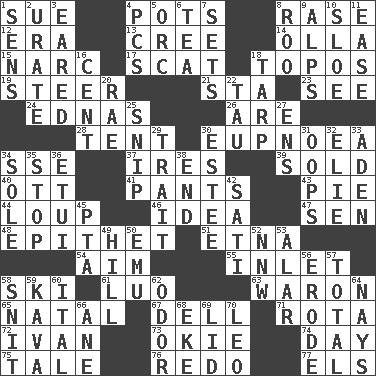 ACROSS 1. Institute legal proceedings 4. Plant holders 8. To erase 12. Period 13. Algonquian 14. Spanish pot 15. Drug cop 17. Go away! 18. Literary convention 19. Navigate 21. R.R. building 23. Perceive with the eye 24. Ferber et al. 26. "We ___ not amused" (Victoria) 28. Portable shelter 30. Normal relaxed breathing 34. Compass dir. 37. Angers 39. Disposed of to a purchaser 40. Baseball player Mel 41. Leg coverings 43. Sliced dessert 44. Central Nebraska county 46. It may be bright or harebrained 47. Elected rep. 48. Curse 51. Inactive volcano in Sicily 54. Direct toward a target or goal 55. An arm off of a larger body of water 58. What Jean-Claude Killy likes to do 61. Nilotic language 63. Make _____ (do battle with) 65. Brizilian seaport 67. Small valley 71. Roll call or roster of names 72. "Terrible" tsar 73. Migrant worker of the '30s 74. 24 hours 75. Falsehood 76. Do over again 77. Raised railways DOWN 1. Elected reps. 2. A salt of uric acid 3. Having ears or earlike features 4. Personal Computers (abbr.) 5. The grampus (Milton) 6. Afternoon social gathering 7. Puts into a specified state 8. Friend of Pooh 9. High mountains 10. A type of plum 11. Comfort 16. Penny 18. Canvas cover 20. Actress Charlotte 22. The 19th letter of the Greek alphabet 25. Clip 27. Followers of ems 29. Distinguishing feature 30. First name in cosmetics 31. I made a mistake 32. Writer Wiesel 33. Arabian gulf 34. Not divided or shared with others 35. Close up, plug up 36. Needle holder 38. Conclude 42. Suttee (variant) 45. Parent Teacher Assoc. 49. Land elevation 50. Australian flightless bird 52. Compass dir. 53. Having or resembling wings 56. Eat (away) 57. "_____ Recall" 58. In a ____ (agitated or irritated) 59. Polynesian shrub of the pepper family 60. Slanted text style (abbr.) 62. Aroma 64. Negative votes 66. A saturated hydrocarbon 68. Supplement with great effort 69. Flaplike covering 70. Lion