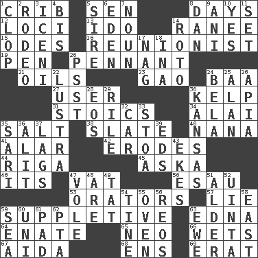 ACROSS 1. Baby bed with high sides 5. Elected rep. 8. 24-hour periods 12. Event scenes 13. Wedding promise 14. The wife of a rajah (variant) 15. Lyric poems 16. One who advocates reunion 19. Animal enclosure 20. Pre-World Series prize 21. Lubricates 23. E Mali city 24. Sound made by sheep 27. One who makes use of a thing 30. Seaweed 31. Unemotional ones 34. Mountain range southwest of Kyrgyzstan 35. Table seasoning 38. Schedule 40. Nanny 41. Having or resembling wings 42. Eats (away) 44. Capital of Latvia 45. "____ silly question..." 46. ___ a Wonderful Life 47. Large container 50. He sold his birthright 53. Speakers 57. Whopper 59. Supplying deficiencies 63. Pulitzer Prize-winning author Ferber 64. Maternal 65. Modern: prefix 66. Moistens 67. Opera by Verdi 68. Followers of ems 69. Part of Q.E.F. DOWN 1. Hoof sound 2. Cowboy competition 3. Ancient Celtic tribe of eastern Britain 4. Again 5. Beget 6. Genesis locale 7. Part of speech 8. One of the 12 tribes of Israel 9. Cuckoo 10. Affirmative reply 11. Put into a specified state 14. Printing process, for short 17. Tired old horse 18. _ tizzy (2 wds.) 20. Inconspicuous attention getter 22. A period of five years 24. Actor Lugosi 25. ____ Jay Lerner 26. Capital of Western Samoa 28. Greek goddess of the dawn 29. Cause heat under the collar 30. Sunflower state 32. 4-wheeled motor vehicle 33. Portico 35. Indian skirt 36. Set down 37. Fails to keep up a pace 39. Begley and Asner 43. Makes supply last 47. Short-tailed, large-bodied rat 48. "We ___ not amused" (Victoria) 49. Make lace 51. Tree or shrub in the Birch family 52. National forest in Provo, Utah 54. Prong on a fork 55. Baking chamber 56. Vintage cars 58. Compass direction 59. Ocean 60. University (slang) 61. Writing tablet 62. Parent Teacher Assoc. 63. She-sheep