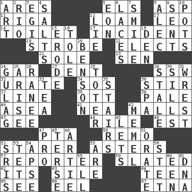 ACROSS 1. Ancient Greek god of war 5. Raised railways 8. Cleo's killer 11. Capital of Latvia 12. Rich soil 13. Lion 14. Bathroom 17. Event 19. Disco prop 21. Chooses 22. Not divided or shared with others 23. Elected rep. 24. Slender fish 27. Incision 29. Compass dir. 32. A salt of uric acid 34. Distress signal 36. Agitate 37. Actor's bit 38. Baseball player Mel 39. Light colored 40. At sea 41. Teachers' org. 42. Promenades 43. Unit of force equal to gravity 44. Cause heat under the collar 46. Eastern Standard Time (abbr.) 47. Parent Teacher Assoc. 50. San ____ (Riviera town) 52. A viewer who gazes fixedly 55. Michaelmas daisies 57. Newsperson 59. Scheduled 62. ___ a Wonderful Life 63. Filth; sediment 64. Adolescent 65. Perceive with the eye 66. Snakelike fish 67. Inactive volcano in Sicily DOWN 1. Nonscientific branch of learning 2. River (Sp.) 3. The front part of a cuirass 4. Table seasonings 5. A really long time 6. Shoestrings 7. Grin 8. Actor Baldwin 9. Posted 10. Plant holders 12. Falsehood 15. Wear away 16. Lacquered or enameled metalware 18. Lair 20. Gillaume's butler role 24. Russian prison camp 25. Ascend 26. Indian princess (variant) 28. Carrier 29. Showing deterioration from age 30. Beverly of Met fame 31. Take or capture by force 33. Beverage made from leaves 35. Flight of steps 36. Health resort 42. Klaipeda city 45. Allows 47. Adept person 48. Laconic 49. Nick name for Arthur 51. Declaim 52. Indian titles of respect 53. False hair 54. Domed church section 55. "We ___ not amused" (Victoria) 56. Proofreading order 58. Pipe bend 60. Car or cant ending 61. Heredity factor (abbr.)