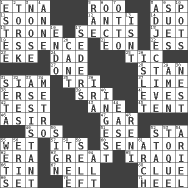 ACROSS 1. Inactive volcano in Sicily 5. Friend of Pooh 8. Cleo's killer 11. Within a short period 12. Against 14. Superhero pair 15. Heavy duty weighing machine 17. Religious groups 18. Type of plane 19. Core 21. Age 22. Double-curved letter 23. Make supply last 24. June honoree 25. Nervous spasm 27. Single 28. Comedian Laurel of Laurel & Hardy 31. Thailand, formerly 35. Three (prefix) 37. Citrus frut 38. Celtic language 39. Indian title of respect (Mr.) 41. Nights before holidays 42. Trial 43. A saturated hydrocarbon 45. Portable shelter 46. SW Saudi Arabia district 47. Slender fish 49. Mayday 51. Compass dir. 52. R.R. building 55. Soggy 57. It is 60. Legislator 62. Period 63. Relatively large 65. Resident of Iraq 66. Metal container 67. 1994 drama film starring Jodie Foster 68. A slight indication 69. Put into a specified state 70. Newt 71. Person who is morally reprehensible DOWN 1. First name in cosmetics 2. Cod relative 3. Trap for birds or small mammals 4. Queen of England 1702-14 5. Actress Charlotte 6. Single time 7. "Beetle Bailey" pooch 8. Descriptive word 9. Institutes legal proceedings 10. Cooking vessels 13. Is not 16. Inside; within (prefix) 17. Spring feasts 20. Patter 26. Small island 29. So be it 30. Egg locale 31. Stalk of a moss capsule 32. Angers 33. Aide 34. Paris' subway 36. Lyricist Gershwin 40. Consume 44. Comfort 48. Painter Guido (1575-1642) 50. Signal 52. Lacking originality or spontaneity 53. Woman's close-fitting hat 54. Satellite of Uranus 55. Moistens 56. 4th largest of the Great Lakes 58. Family _ (genealogy) 59. Oneself 61. Bowlike part 64. The first octave above the treble staff