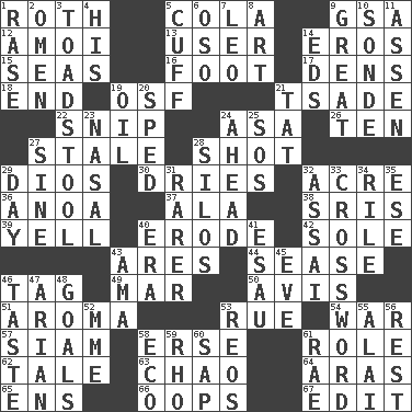 ACROSS 1. Writer of Portnoy's Complaint (1969) 5. Root beer relative 9. Girls' org. (abbr.) 12. Mine, in Marseilles 13. One who makes use of a thing 14. Greek god of love 15. Oceans 16. One third of a yard 17. Habitations of wild animals 18. Conclude 19. Order of Saint Francis (abbr.) 21. Sadhe (variant) 22. Clip 24. White ___ sheet 26. "___ Little Indians" 27. Having lost freshness 28. Guess 29. "Vaya con ____" 30. Frees from moisture 32. 43,560 square feet 36. Small Philippine buffalo 37. In the manner of 38. Indian titles of respect 39. Shout 40. Wear away 42. Not divided or shared with others 43. Ancient Greek god of war 44. Gospel singer Marvin 46. Label 49. Spoil 50. Deliberation 51. Odor 53. Sorrow 54. Armed conflict 57. Thailand, formerly 58. Celtic language 61. Hero or heavy, e.g. 62. Falsehood 63. US Secretary of Labor Elaine L. _ 64. Ancient river in northeast Turkey 65. Followers of ems 66. I made a mistake 67. Prepare for publication DOWN 1. Raze (variant) 2. Sign of something about to happen 3. Inedible or poisonous agaric 4. Part of HMS, perhaps 5. _ links 6. Bear (Spanish) 7. Lion 8. Nonscientific branch of learning 9. Relatively large 10. Message 11. NE Netherlands city 14. Begley and Asner 19. Lubricate 20. Moved rapidly 21. Make lace 23. Relating to the nose 24. At or in the front 25. Distress signal 27. Trig term 28. Grain storage towers 29. 24 hours 31. More valued for its uncommonness 32. Slender Brazilian palm 33. What you're doing now 34. Cause heat under the collar 35. Compass dir. 40. Epoch 41. He sold his birthright 43. Housemaid (var.) 45. First lady 46. Clothes sense 47. Believer in; advocate of (suffix) 48. Purposes of endeavors 52. Madame (abbr.) 53. Vintage cars 55. Jai _ 56. State of inaction 58. Environmental prefix 59. 17th letter of the Greek alphabet 60. Plant excrement 61. Actress Charlotte