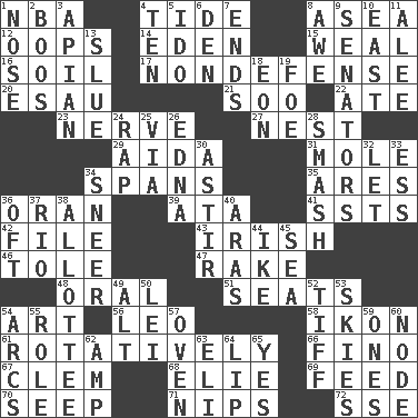 ACROSS 1. Basketball assoc. 4. Event that recurs at intervals 8. At sea 12. I made a mistake 14. Paradise 15. Welt 16. The visible part of the earth's surface 17. Unrelated to defense, as in spending 20. He sold his birthright 21. "Barney Miller" actor Jack 22. Had dinner 23. Impudent aggressiveness 27. Egg locale 29. Opera by Verdi 31. Undercover agent 34. Connects, as a bridge 35. Ancient Greek god of war 36. Northwest Algerian city 39. _ moment's notice (2 wds.) 41. Fast planes 42. Do some clerical work 43. From or relating to Ireland 46. Lacquered or enameled metalware 47. Immoral or dissolute person 48. Spoken 51. Theater features 54. Nonscientific branch of learning 56. Lion 58. Picture 61. Producing rotation 66. A pale, very dry sherry 67. Clement's nick name 68. Writer Wiesel 69. Nourish 70. Ooze 71. Cuts off 72. Compass dir. DOWN 1. Olfactory organ 2. Scornful sounds 3. Bee-related 4. "___ Little Indians" 5. Wedding promise 6. Lair 7. Conclusions 8. Deep reverence 9. Legislators 10. 90 degrees 11. Toward shelter 13. Change direction abruptly 18. Period of immesurable duration 19. Enemy 24. Reproach for some lapse or misdeed 25. By way of 26. Pulitzer Prize-winning author Ferber 28. Box-office sellout 30. Moving about 32. Allow 33. Curvy letter 34. Scornful expression 36. Often (poetically) 37. _ de Janeiro 38. One to whom something is allotted 40. Caspian sea tributary 44. D.D.E's nickname 45. Ocean 49. The first octave above the treble staff 50. Flowery wreath 52. Small quarrel 53. Atmospheres 54. Curves 55. Hero or heavy, e.g. 57. Baking chamber 59. Singles 60. Connecting point 62. Electrical Unit 63. Biblical high priest 64. Mouth edge 65. Affirmative reply