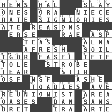 ACROSS 1. Equivocates 5. Actor Linden 8. Kill 12. Washington bills 13. Mouth or opening 14. Sibling's daughter 15. Pace 16. Seigniories (variant) 19. Had dinner 20. Thinks logically 21. Celtic language 23. Actress Charlotte 24. Cleo's killer 27. Afternoon social gatherings 30. _ mater 31. Anew 34. Land 35. Composer Stravinsky 38. Artist's stand 40. Wig 41. Lacquered or enameled metalware 42. Disco prop 44. Separate forcefully 45. Use a spoon 46. Order of Saint Francis (abbr.) 47. Overdraft (abbr.) 50. American tennis player Robert 53. Sycophants 57. "___ Maria" 59. One who advocates reunion 63. Type of rug 64. Fertile tracts in a desert 65. One of the 12 tribes of Israel 66. Without 67. Cy Young winner Saberhagen 68. Retirement account (abbr.) 69. Johnson of "Laugh-In" DOWN 1. Israeli folk dance 2. Related on the mother's side 3. Distance measurement 4. Compass dir. 5. Stockings 6. Operatic vocal solo 7. Straggles 8. Title for a knight 9. Flowery wreath 10. Adept person 11. Affirmative reply 14. Characteristic smell of wine 17. Not either 18. _ tizzy (2 wds.) 20. Coral ridge 22. A viewer who gazes fixedly 24. _ vera 25. Stricken, poetically 26. Light colored 28. "We ___ not amused" (Victoria) 29. Oceans 30. Michaelmas daisies 32. Fast jet (abbr.) 33. Possessive pronoun 35. "Tell ____ the Marines!" 36. Travels 37. Norwegian king 39. Car dealer's back yard 43. Prejudice 47. Nuclear Threat Initiatives 48. "Barney Miller" actor Jack 49. Avid follower 51. Ethiopian city, capital of Harari 52. Happening 54. "You Light Up My Life" star Conn 55. Austrian river, tributary to the Danube 56. Inactive volcano in Sicily 58. Relaxation 59. Director Reiner 60. Ewer handle 61. Purpose 62. Remaining after all deductions 63. White ___ sheet