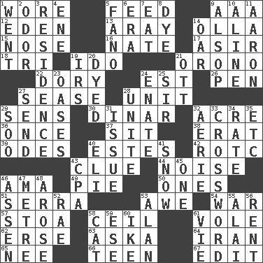 ACROSS 1. Had on 5. Nourish 9. Auto club (abbr.) 12. Paradise 13. Like ___ of sunshine 14. Water jar 15. Sense of smell 16. Nathan's nickname 17. SW Saudi Arabia district 18. Three (prefix) 19. Wedding promise 21. U. of Maine site 22. Dinghy 24. Eastern Standard Time (abbr.) 26. Writing instrument 27. Gospel singer Marvin 28. A single undivided whole 29. Elected reps. 30. Middle Eastern gold or silver currency 32. 1/640 square mile 36. At one time in the past 37. Be seated 38. Part of Q.E.F. 39. Lyric poems 40. _____ Park, CO 42. College mil. group 43. A slight indication 44. Annoying sound 46. Wet nurse (var.) 49. Sliced dessert 50. Washington bills 51. Father Junipero _ 53. Deep reverence 54. Armed conflict 57. Portico 58. To provide with a ceiling 61. Short-tailed, large-bodied rat 62. Celtic language 63. "____ silly question..." 64. SW Asia republic 65. Born 66. Adolescent 67. Prepare for publication DOWN 1. Left 2. Aroma 3. Home 4. Compass dir. 5. Papal veil 6. Period 7. Erode 8. Color 9. Columnist Joseph or Stewart 10. Place in a line 11. Composer Copland 14. Rowing implement 19. Big collection agency 20. Colored 21. Baseball player Mel 23. Fertile tracts in a desert 24. Maternal 25. Title for a knight 27. Transmit 28. Join together 29. "Barney Miller" actor Jack 31. Come out of 32. Nest on high 33. What you're doing now 34. Pace 35. And so on (abbr.) 40. Connecticut Ivy Leaguer 41. Overwhelm 43. Numbers guy (abbr.) 45. Single 46. NE Netherlands city 47. Distance measurement (Brit.) 48. Came up 52. Actress Charlotte 53. Actor Alda or Thicke 55. Jai _ 56. Monthly bill 58. Domesticated feline 59. Compass dir. 60. Mamie's mate 61. Compete