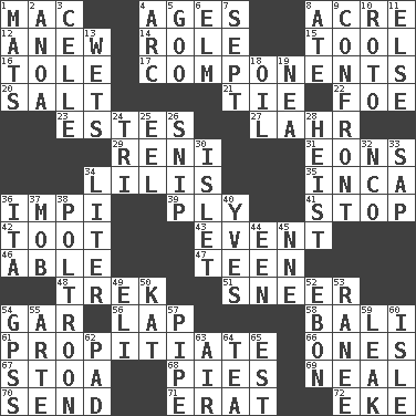 ACROSS 1. Apple computer (short form) 4. Grows older 8. Measure of real estate 12. Afresh 14. Hero or heavy, e.g. 15. Utensil 16. Lacquered or enameled metalware 17. Pieces 20. Table seasoning 21. Standoff 22. Enemy 23. _____ Park, CO 27. Cowardly lion portrayer 29. Painter Guido (1575-1642) 31. Immeasurably long periods of time 34. Ms. Damita and namesakes 35. South American Indian 36. Body of Kaffir warriors 39. Travel a route regularly 41. Close up, plug up 42. A blast of a horn 43. Happening 46. Competent 47. Adolescent 48. Long journey 51. Contemptuous expression 54. Slender fish 56. Pet locale 58. Indonesian resort city 61. Conciliate 66. Washington bills 67. Portico 68. Sliced desserts 69. Anneal 70. Transmit 71. Part of Q.E.F. 72. Supplement with great effort DOWN 1. Floor coverings 2. Small Philippine buffalo 3. Cell (Danish) 4. Curve 5. Thick or sticky substance 6. Shade tree 7. Back-to-school mo. 8. Had dinner 9. Meet 10. Printing process, for short 11. Otherwise 13. Soaks 18. Petroleum 19. Teachers' org. 24. Three (prefix) 25. Snakelike fish 26. Sever or remove by pinching or nipping 28. Robbery 30. Small island 32. Non-commissioned officer (abbr.) 33. Plant excrement 34. 61 cubic inches 36. Call ___ day 37. Disorderly crowd 38. Characterized by complete cowardliness 40. Jacques Cousteau's middle name 44. Car or cant ending 45. Compass dir. 49. Biblical high priest 50. Krazy ___ of comics 52. Inky black, to poets 53. Indian princess (variant) 54. Global Positioning Systems (abbr.) 55. Johnson of "Laugh-In" 57. Corncob 59. Path through which fluid escapes 60. Small island 62. Groovy apt. 63. Wind 64. Afternoon social gathering 65. Eastern Standard Time (abbr.)