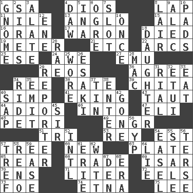 ACROSS 1. Girls' org. (abbr.) 4. "Vaya con ____" 8. Pet locale 11. Mediterranean tributary 13. White American of non-Hispanic descent 15. Wing 16. NW Algerian seaport 17. Make _____ (do battle with) 18. Passed on 19. Distance measurement 21. And so on (abbr.) 22. Arches 23. Compass dir. 24. Deep reverence 27. Australian flightless bird 29. Vintage cars 30. Match 34. To separate or throw off 36. Pace 39. Riviera of "Kiss of the Spider Woman" 40. Simple or foolish person 41. Supplementing with great effort 43. Strained 44. Goodbye (Sp.) 46. To the inside or interior of 47. Connecticut Ivy Leaguer 48. _ dish (used to culture cells) 49. Engineer (abbr.) 51. Three (prefix) 53. Marina Del _, California 54. Eastern Standard Time (abbr.) 57. Relationship diagram 60. ___ Haven, CT 63. Food holder 65. Buttocks 66. Exchange 69. Austrian river, tributary to the Danube 70. Followers of ems 71. 61 cubic inches 72. Snakelike fish 73. Enemy 74. Inactive volcano in Sicily 75. Area sheltered from the wind DOWN 1. Dwarf 2. Fathers 3. Having winglike extensions 4. Fool 5. _ tizzy (2 wds.) 6. Legendary monster 7. Narrow opening 8. Den 9. Actor Baldwin 10. Writing tablets 12. Compass dir. 14. Single time 18. Female child 20. Actress Charlotte 25. Had on 26. 1973 Nobel Price Winner (Physics) Leo 28. Big _ 29. Newsperson 31. Monetary unit of Yemen 32. Needle holder 33. Consume 34. Travel on or in a vehicle 35. Send forth 37. Shallow baking pan 38. Keyboard key 40. Plant excrement 42. Went 45. Title for a knight 50. Flimflam 52. International (abbr.) 54. Artist's stand 55. Lacking originality or spontaneity 56. Laconic 57. Not kosher 58. Western Nevada city 59. Relaxation 61. One of the Great Lakes 62. Electrical Unit 64. Falsehood 67. Lair 68. Epoch