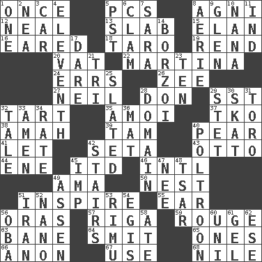 ACROSS 1. At one time in the past 5. Personal Computers (abbr.) 8. Hindu god of fire 12. Actress Patricia 13. Broad, flat, thick piece 15. Liveliness 16. Having ears or earlike features 18. Edible starchy tuberous root 19. Tear apart 20. Large container 22. Chrissie's court nemesis 24. Blunders 26. Last letter of the English alphabet 27. Famous astronaut Armstrong 28. Spanish title 29. Fast jet (abbr.) 32. Small pie 35. Mine, in Marseilles 37. Ring climax 38. Wet nurse 39. Scottish cap 40. Lightbulb-shaped fruit 41. Allow 42. Bristle 43. Von Bismarck 44. Compass dir. 45. It would 46. International (abbr.) 49. Nanny (var.) 50. A home for chicks 51. Heighten or intensify 55. Ewer handle 56. Mouths or openings 57. Capital of Latvia 59. Makeup applied to the cheeks 63. Object of repulsion 64. Stricken, poetically 65. Washington bills 66. Soon (poet.) 67. Purpose 68. Mediterranean tributary DOWN 1. Single 2. Teachers' org. 3. Auto 4. Veterans Day date 5. Pacific Standard Time (abbr.) 6. Dollar (slang) 7. "Two Mules for Sister ____" 8. Nest on high 9. Small, secluded valley 10. Grandmother 11. Working for oneself (abbr.) 14. Tall, slender dog 17. Have the gumption 21. Three (prefix) 23. Nine, plus one 25. Scheduled 28. Realm 29. Proofreading order 30. Three-handed card game 31. "Corrida" creature 32. Lie 33. So be it 34. Pace 36. Floor protector 40. Coward 42. Flight of steps 45. Naughty child 47. Born 48. Russian ruler of old 49. NE Netherlands city 51. SW Asia republic 52. Billionth: prefix 53. Tall New Zealand timber tree 54. The front part of a cuirass 56. Chief or king in Benin or Nigeria 58. Had dinner 60. Corn or form start 61. Set 62. Compass dir.