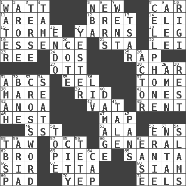 ACROSS 1. Electrical Unit 5. ___ Haven, CT 8. Automobile 11. Type of rug 12. Cy Young winner Saberhagen 14. Connecticut Ivy Leaguer 15. Singer Mel 17. Tall tales 18. Part of a journey 19. Core 21. R.R. building 22. Luau accessory 23. To riddle 24. Two (Sp.) 25. Strike 27. Baseball player Mel 28. Burn to charcoal 31. Lettered men learn these first 35. Snakelike fish 37. Heavy book 38. Female horse 39. To free from 41. Singles 42. Small Philippine buffalo 43. Large container 45. Monthly bill 46. Behest 47. Atlas unit 49. Fast jet (abbr.) 51. According to 52. Followers of ems 55. The 23rd letter of the Hebrew alphabet 57. Sep. follower 60. Commissioned military rank 62. Sis' sibling 63. Component 65. Before Barbara or Clara 66. Title for a knight 67. Singer James 68. Thailand, formerly 69. Writing tablet 70. Slangy assent 71. Snakelike fish DOWN 1. Wetness 2. Came up 3. Laconic 4. Not wild 5. Basketball assoc. 6. Blunders 7. Left 8. Portable communications device 9. Toward shelter 10. Swiss mountan, "Queen of the Mountains" 13. Russian ruler of old 16. Inside; within (prefix) 17. Of or pertaining to yesterday 20. ____ d'Azur (French Riviera) 26. Thespian 29. So be it 30. Take ten 31. Nursemaid 32. Object of repulsion 33. What you're doing now 34. Theater features 36. 54 in ancient Rome 40. Break 44. Falsehood 48. Zero-star reviews 50. Drink excessively 52. Bert's buddy 53. Relating to or accompanying birth 54. Shuts with force 55. Cook's measure (abbr.) 56. Operatic vocal solo 58. Municipality 59. False hair 61. Relaxation 64. Head covering