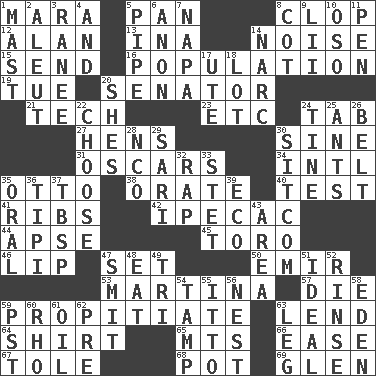 ACROSS 1. Hindu Mythology: god of death 5. Baking dish 8. Hoof sound 12. ____ Jay Lerner 13. _ tizzy (2 wds.) 14. Annoying sound 15. Transmit 16. Census information 19. Third day of the wk. 20. Legislator 21. Technician 23. And so on (abbr.) 24. Bar bill 27. Coop moms 30. Trig term 31. Motion picture awards 34. International (abbr.) 35. "Beetle Bailey" pooch 38. Speak pompously 40. Trial 41. Teases 42. Medicinal drug used to evoke vomiting 44. Domed church section 45. "Corrida" creature 46. Mouth edge 47. Put into a specified state 50. Independent ruler or chieftain 53. Chrissie's court nemesis 57. Pass on 59. Conciliate 63. Grant temporary use of 64. Chest covering 65. Mountains (abbr.) 66. Comfort 67. Lacquered or enameled metalware 68. Plant holder 69. Small, secluded valley DOWN 1. Vertical spar for supporting sails 2. Eskimo relative 3. Indian princess (variant) 4. Also 5. Corncob 6. At once, immediately (arch.) 7. California wine valley 8. Small bed 9. Cards in a Roman deck? 10. Bear (Spanish) 11. Fenced enclosure 14. Drug cop 17. Shoshoni 18. Car dealer's back yard 20. "______ My Girl" (Turtles hit) 22. Elect 24. Prong on a fork 25. Pismires 26. Waist strap 28. Non-commissioned officer (abbr.) 29. Indian skirt 30. "Cheers" or "Ellen" 32. Strike 33. Proofreading order 35. Of the mouth 36. Native american tent (variation) 37. Cook's measure (abbr.) 39. Environmental prefix 43. Length times width 47. Stricken, poetically 48. Ingest 49. Three (prefix) 51. Standard of perfection 52. Wash lightly 54. Pack (down) 55. "Tell ____ the Marines!" 56. A home for chicks 58. Paradise 59. Pacific Standard Time (abbr.) 60. 17th letter of the Greek alphabet 61. Lubricate 62. Before (prefix) 63. Part of a journey