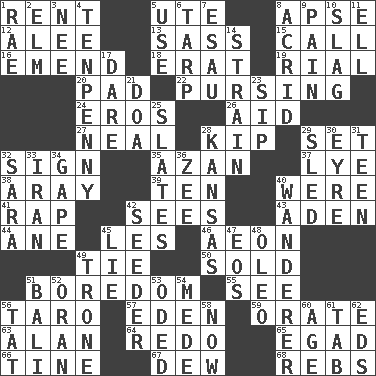 ACROSS 1. Monthly bill 5. Shoshoni 8. Domed church section 12. Toward shelter 13. Backtalk 15. Give a ring to 16. Make improvements or corrections to 18. Part of Q.E.F. 19. Monetary unit of Yemen 20. Groovy apt. 22. Puckering 24. Greek god of love 26. Help 27. Be tempered by heat 28. Monetary unit of Laos 29. Put into a specified state 32. Omen 35. Muslim summons to prayer 37. Sodium hydroxide 38. Like ___ of sunshine 39. "___ Little Indians" 40. We are 41. Hit sharply and swiftly 42. Observes 43. Arabian gulf 44. One (Scot) 45. French article 46. Age 49. Standoff 50. Exchanged or delivered for money 51. Mood resulting from idleness 55. Observe 56. Edible starchy tuberous root 57. Genesis locale 59. Declaim 63. Actor Alda or Thicke 64. Make new 65. Mild oath 66. Prong on a fork 67. Morning condensation 68. Confederate soldiers (slang) DOWN 1. Actress Charlotte 2. Shade tree 3. Born 4. 3-inch nail 5. Purpose 6. Canvas cover 7. He sold his birthright 8. Sour-tasting 9. Ache 10. Volcanic refuse 11. Pipe bend 14. Put through a sieve 17. Have the gumption 21. ___ good deed 23. Small drink 25. Chalkboards 28. Sunflower state 29. Downhill vehicle 30. Jane of fiction 31. Adolescent 32. "Two Mules for Sister ____" 33. SW Asia republic 34. Open wide 36. Last letter of the English alphabet 40. Nomad 42. Sowing specialist 45. Whopper 47. Greek goddess of the dawn 48. Butter sub 49. Heavy duty weighing machine 51. Indonesian resort city 52. NW Algerian seaport 53. Wrote a lyric poem 54. Ancient Persian 56. Make lace 58. Immediately 60. Personal question 61. Keyboard key 62. Begley and Asner