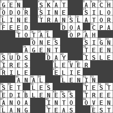 ACROSS 1. Commissioned mil. rank 4. Three-handed card game 8. Bowlike part 12. Scent 14. Trig term 15. Grain storage tower 16. Actor's bit 17. Interpreter 20. Nourish 21. ___ good deed 22. Accounting whiz (abbr.) 23. Add up to 27. Brightly colored fish 29. Washington bills 31. Attach a signature 34. Rep 35. Adolescent 36. Soap bubbles 39. 24 hours 41. Capri or Wight 42. Angers 43. Crowbar 46. Cause heat under the collar 47. Writer Wiesel 48. Of or related to the anus 51. Soviet premier 1918-24 54. Put into a specified state 56. French article 58. Trial 61. The property of being fit to eat 66. Woody plant 67. Small Philippine buffalo 68. To the inside or interior of 69. Baking chamber 70. Austrian-born American filmmaker Fritz 71. Beverages made from leaves 72. Eastern Standard Time (abbr.) DOWN 1. _ course 2. Singer Brickell 3. Music written for nine 4. Fast jet (abbr.) 5. Apertif with cassis 6. Santa ___, CA 7. Watch over 8. White ___ sheet 9. Actors Guy, Robert Welles, and Clint 10. Hoof sound 11. Israeli folk dance 13. Make new 18. "Barney Miller" actor Jack 19. Infant locale 24. Coat; cloak 25. One (Scot) 26. Grant temporary use of 28. Moving about 30. Showing deterioration from age 32. Set 33. Compass dir. 34. NE Netherlands city 36. Title for a knight 37. RI univ. 38. Conveyance 40. Shout 44. Compete 45. Car or cant ending 49. Everything 50. Area sheltered from the wind 52. "Tell ____ the Marines!" 53. Boldness 54. Lick closed 55. Pulitzer Prize-winning author Ferber 57. In a ____ (agitated or irritated) 59. Observes 60. Portable shelter 62. Container for groceries 63. Compass dir. 64. R.R. building 65. Distress signal