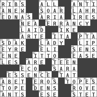 ACROSS 1. Chest bones 5. 100% 8. Against 12. Afresh 13. Fly high 15. Cowardly lion portrayer 16. Ferber et al. 18. Operatic vocal solo 19. Angers 20. Teachers' org. 22. The state or an instance of erring 24. Put down 26. Mamie's husband 27. Johnson of "Laugh-In" 28. Call ___ day 29. Parent Teacher Association (abbr.) 32. Neighbor of Neb. 35. Kenny Rogers chart-topper in '80 37. Mouth edge 38. Jane of fiction 39. Biblical high priest 40. Elected reps. 41. Compass dir. 42. "Tell ____ the Marines!" 43. Comfort 44. French article 45. "We ___ not amused" (Victoria) 46. Adolescent 49. Environmental prefix 50. "Two Mules for Sister ____" 51. Center 55. Make lace 56. Collude with 57. Greek god of love 59. Drinks excessively 63. Drink excessively 64. Lairs 65. Be footloose 66. Pismires 67. Compass dir. 68. Proofreading order DOWN 1. Actress Charlotte 2. Working for oneself (abbr.) 3. Benjamin's nick name 4. Tchaikovsky ballet 5. White ___ sheet 6. Old wives' tales, e.g. 7. Den 8. Place in a line 9. Drug cop 10. Those things 11. Big collection agency 14. Noteworthy scarcity 17. Shrivel 21. Small island 23. Alias (abbr.) 25. Keyboard key 28. Foolish or stupid persons 29. Entreaty 30. Airtight sealed metal containers 31. Domed church section 32. Stitch closed the eyes of (a falcon) 33. Unit of force 34. Ancient Greek god of war 36. Keyboard modifier key 40. Legislators 42. Pressed 45. Adept person 47. Erode 48. Part of Q.E.F. 49. _____ Park, CO 51. Inky black, to poets 52. Back-to-school mo. 53. Algonquian 54. Immeasurably long periods of time 56. "One Day ___ Time" 58. Compass dir. 60. Plant holder 61. First lady 62. Put into a specified state