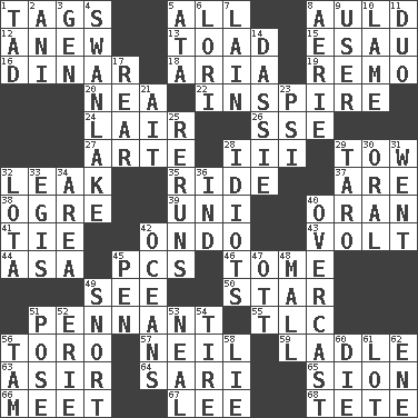 ACROSS 1. Labels 5. Everything 8. Old (Scot.) 12. Afresh 13. Frog relative 15. He sold his birthright 16. Middle Eastern gold or silver currency 18. Operatic vocal solo 19. San ____ (Riviera town) 20. Teachers' org. 22. Motivate 24. Den 26. Compass dir. 27. Johnson of "Laugh-In" 28. One more than two 29. Pull behind 32. Path through which fluid escapes 35. Travel on or in a vehicle 37. "We ___ not amused" (Victoria) 38. Legendary monster 39. Corn or form start 40. NW Algerian seaport 41. Standoff 42. Southwest Nigerian state 43. Electrical Unit 44. White ___ sheet 45. Personal Computers (abbr.) 46. Heavy book 49. Perceive with the eye 50. Play the lead 51. Pre-World Series prize 55. Affectionate concern, for short 56. "Corrida" creature 57. Famous astronaut Armstrong 59. Dipping utensil 63. SW Saudi Arabia district 64. Indian skirt 65. The Jewish people; Israel 66. Rendezvous 67. Area sheltered from the wind 68. False hair DOWN 1. Small amount or degree 2. Black tropical American cuckoo 3. Commissioned military rank (abbr.) 4. Tchaikovsky ballet 5. _ moment's notice (2 wds.) 6. Australian parrot (variant) 7. (Had) reclined 8. Nest on high 9. One who uses or employs something 10. Unable to walk 11. Superhero pair 14. Hyrax 17. Located in or toward the back 21. Small island 23. Air pressure measure (abbr.) 25. Summer TV shows 28. Foolish or stupid persons 29. Edible starchy tuberous root 30. Of the mouth 31. Gone 32. Globular water bottle used in Asia 33. Armor plate that protects the chest 34. Length times width 36. Indiana (abbr.) 40. Cloudy 42. Seas 45. Fenced enclosure 47. Baseball player Mel 48. Promenade 49. Derisive sound 51. Airs 52. One of the Great Lakes 53. Actress Patricia 54. Become fatigued 56. Scottish cap 58. Whopper 60. Expire 61. Car dealer's back yard 62. Compass dir.