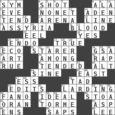 ACROSS 1. Symbol (abbr.) 4. Guess 8. Insect wing 11. Night before a holiday 12. Music written for nine 14. Arabian gulf 15. Be inclined (to) 17. Sports stadium 18. Actor's bit 19. Nineveh was its capital 21. Vital fluid 23. Snakelike fish 24. Consenting reply 25. Inside; within (prefix) 27. Loyal 30. Environmental prefix 31. A viewer who gazes fixedly 34. Girls' org. (abbr.) 37. Tate display 38. Amid 39. Reproach for some lapse or misdeed 40. Regret 41. Looked after 43. Keyboard modifier key 44. Trig term 45. 90 degrees 47. Curvy letter 49. Bit 50. Prepares for publication 52. Preparing or cooking with lard 56. Papal veil 57. Perfect 60. Portico 61. Northwest Algerian city 62. Singer Mel 63. Viper 64. Followers of ems 65. Plant excrements 66. Area sheltered from the wind DOWN 1. Stalk of a moss capsule 2. Jacques Cousteau's middle name 3. Not women's 4. Slow-paced one 5. Israeli folk dance 6. Single 7. "___ Little Indians" 8. Goodbye (Sp.) 9. Grant temporary use of 10. One (Scot) 13. Keyboard key 14. Medicinal plant 16. Colored 20. Vintage cars 22. Potassium hydroxide 25. Shade of tan 26. Short letter 27. Marketplace scale 28. Tear apart 29. Goad 30. Ewer handle 32. Jacques of French films 33. So be it 34. Pate de foie ____ 35. Table seasoning 36. Fitting 42. Letter starter 44. Fast jet (abbr.) 46. Sums up 47. Ferber et al. 48. The Jewish people; Israel 49. Stories 50. Merit 51. Be seated 52. Desk light 53. Slanted text style (abbr.) 54. Sense of smell 55. Open wide 56. Enemy 58. Two (Sp.) 59. Epoch