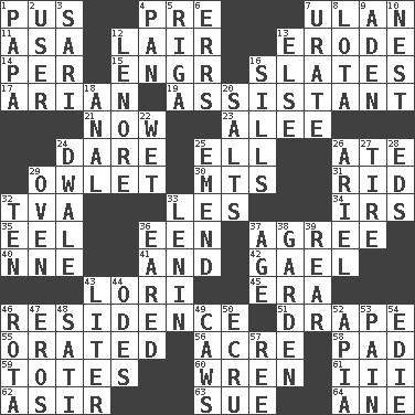 ACROSS 1. Purulenc 4. Before (prefix) 7. ____ Bator, Mongolia 11. White ___ sheet 12. Den 13. Wear away 14. For each 15. Engineer (abbr.) 16. Chalkboards 17. Believer in; advocate of (suffix) 19. Aide 21. At this time 23. Toward shelter 24. Have the gumption 25. Pipe bend 26. Had dinner 29. A small or young owl 30. Mountains (abbr.) 31. To free from 32. Federal power corp. 33. French article 34. Big collection agency 35. Snakelike fish 36. Car or cant ending 37. Match 40. Compass dir. 41. Plus 42. Highlander 43. Australian parrot (variant) 45. Epoch 46. Dwelling 51. Window treatment 55. Declaimed 56. Land measure 58. Writing tablet 59. Hauls 60. Songbird 61. One more than two 62. SW Saudi Arabia district 63. Take to court 64. One (Scot) DOWN 1. Dad 2. One who uses or employs something 3. Indian skirt 4. Baking dish 5. Capital of Latvia 6. Blunders 7. A salt of uric acid 8. Globular water bottle used in Asia 9. Arabian gulf 10. A home for chicks 12. Poe poem 13. Otherwise 16. Beverly of Met fame 18. Of or related to the anus 20. Table seasonings 22. Dripping 24. A sleeping potion; an opiate (poet.) 25. Make improvements or corrections to 26. Satellite of Uranus 27. Hoop that covers a wheel 28. Begley and Asner 29. Baking chamber 32. Nine, plus one 33. Soviet premier 1918-24 36. Having ears or earlike features 37. Mature 38. Place where plants grow 39. Located in or toward the back 43. 61 cubic inches 44. Lyric poems 46. Roll call or roster of names 47. Greek god of love 48. Suttee (variant) 49. Crow sounds 50. Shade of tan 52. Capital of Western Samoa 53. Ache 54. Singer Brickell 57. Portuguese money of account (variant)