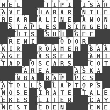 ACROSS 1. Cartoonist voice _ Blanc 4. Native american tent (variation) 8. Austrian river, tributary to the Danube 12. "___ Maria" 13. Ethiopian city, capital of Harari 14. Mediterranean tributary 15. Hitchcock's "____ Window" 17. Place in a line 18. Soon (poet.) 19. Paper fasteners 21. Burned superficially 23. Part of HMS, perhaps 24. Quiet! 26. Unit of force equal to gravity 27. Painter Guido (1575-1642) 28. Scent 30. Apertif with cassis 31. Wanderer 34. Sound made by sheep 37. Personal question 38. NE Netherlands city 39. Black tropical American cuckoo 40. Small boy 41. Motion picture awards 42. Small bed 43. Type of rug 44. "____ silly question..." 46. Basketball assoc. 47. Hit sharply and swiftly 50. Personal Computers (abbr.) 51. Ringlike coral islands and reefs 54. Portable computers 57. Sense of smell 58. Feeling or showing extreme anger 60. Falsehood 62. Makes supply last 63. 61 cubic inches 64. Island 65. Compass direction 66. Paradise 67. She-sheep DOWN 1. Make imperfect 2. Nights before holidays 3. Tough but pliablecoriaceous 4. Lies 5. From or relating to Ireland 6. Baking dish 7. Angers 8. More lacking in sense or substance 9. Scorch 10. Medicinal plant 11. Tear apart 13. Actor Linden 16. Precipitation 20. 23rd letter of the Greek alphabet 22. Composer Stravinsky 25. Homing pigeon 27. Capital of Latvia 29. Habitations of wild animals 30. Krazy ___ of comics 31. To erase 32. Witty Wilde 33. White ___ sheet 34. Keyboard key 35. Small Philippine buffalo 36. Small island 41. Taken by mouth 43. Most capable 44. Fitting 45. Native of Scotland 46. Olfactory organs 48. Having winglike extensions 49. Eucharist need 51. Afresh 52. Casino tip 53. Drop; flow; fall 55. For each 56. Cole _ (cabbage dish) 59. To free from 61. Sight organ