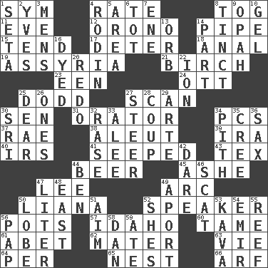 ACROSS 1. Symbol (abbr.) 4. Assign a rank or rating to 8. Coat; cloak 11. Night before a holiday 12. U. of Maine site 14. Corncob 15. Watch over 17. Prevent from occurring 18. Of or related to the anus 19. Nineveh was its capital 21. A tree used for making furniture 23. Car or cant ending 24. Baseball player Mel 25. Texas town _ City 27. Skim 30. Elected rep. 31. Speaker 34. Personal Computers (abbr.) 37. Actress Charlotte 38. Native American of Southwest Alaska 39. Lyricist Gershwin 40. Big collection agency 41. Oozed 43. John Ritter's dad 44. Fermented drink made from hops 45. American tennis player Robert 47. Area sheltered from the wind 49. Curve 50. Climbing, woody, usually tropical vines 52. Orator 56. Cooking vessels 57. Potato state 60. Docile 61. Collude with 62. Mother 63. Compete 64. For each 65. A home for chicks 66. Sandy's bark DOWN 1. Stalk of a moss capsule 2. Jacques Cousteau's middle name 3. Not women's 4. "The Thinker" sculptor 5. Type of rug 6. Small child 7. Compass dir. 8. Colored lightly or faintly 9. Brightly colored fish 10. Set 13. Globe 14. Component 16. Colored 20. Redecorate 22. Electrically charged atom 25. Letter starter 26. Singles 27. Guide 28. Clever action or accomplishment 29. Johnson of "Laugh-In" 30. Indian title of respect (Mr.) 32. To erase 33. Toward shelter 34. Essential or central part 35. Algonquian 36. Saxophone 42. Have the gumption 44. Benjamin's nick name 46. Go away! 47. 61 cubic inches 48. Compass direction 49. To the left, to Queeg 50. Ear part 51. Direct toward a target or goal 52. "______ My Girl" (Turtles hit) 53. Polynesian shrub of the pepper family 54. Independent ruler or chieftain 55. Coral collection 56. Infant food 58. One of the 12 tribes of Israel 59. Had dinner