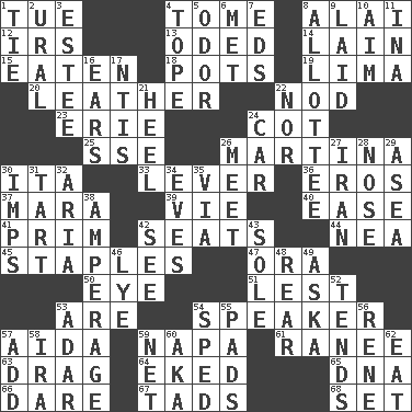 ACROSS 1. Third day of the wk. 4. Heavy book 8. Jai _ 12. Big collection agency 13. Wrote a lyric poem 14. (Had) reclined 15. Ingested 18. Cooking vessels 19. Pale green bean 20. Cordwainer's material 22. Dreamland 23. 4th largest of the Great Lakes 24. Small bed 25. Compass dir. 26. Chrissie's court nemesis 30. Call ___ day 33. Crowbar 36. Greek god of love 37. Hindu Mythology: god of death 39. Compete 40. Comfort 41. Demure 42. Theater features 44. Teachers' org. 45. Paper fasteners 47. Mouth or opening 50. Sight organ 51. For fear that 53. "We ___ not amused" (Victoria) 54. Orator 57. Opera by Verdi 59. California wine valley 61. The wife of a rajah (variant) 63. To be drawn or hauled along 64. Supplemented with great effort 65. Heredity factor (abbr.) 66. Have the gumption 67. Bits 68. Put into a specified state DOWN 1. Neckwear 2. Mountain range 3. First name in cosmetics 4. Drink excessively 5. Scent 6. Was introduced to 7. Begley and Asner 8. One to whom something is allotted 9. Put down 10. Direct toward a target or goal 11. _ tizzy (2 wds.) 16. Hearing organs 17. Nuclear Threat Initiatives 21. The bottom of a shoe or boot 22. Not either 24. Automobile 26. Rendezvous 27. SW Asia republic 28. Characteristic smell of wine 29. Toward the sea 30. Naughty children 31. Small pie 32. Roberta Peters solo 34. Nights before holidays 35. By way of 38. Electrical Measurement 42. Observe 43. Flatfish 46. Potassium hydroxide 48. Located in or toward the back 49. "____ silly question..." 52. Is inclined (to) 53. The sixth month of the Jewish calendar 54. Broke a traffic law 55. Groovy apts. 56. French philosopher Descartes 57. Increase 58. Retirement account (abbr.) 59. Remaining after all deductions 60. Alias (abbr.) 62. Consume