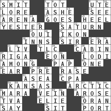 ACROSS 1. Stricken, poetically 5. Small child 8. Shoshoni 11. Old wives' tales, e.g. 12. American tennis player Robert 14. Observe 15. Sports stadium 17. Moves 18. Person who is morally reprehensible 19. Of or pertaining to yesterday 21. Titan orbits this 23. Fr. "Yes" 25. Visual representation of an object 26. Restaurants 27. Title for a knight 28. Epoch 31. 54 in ancient Rome 33. Affectionate concern, for short 35. Small house or cottage 37. Port city in Latvia 38. Period of immesurable duration 40. Farming town in central California 41. Amid 43. Infant food 45. Single 46. Hearing organ 47. Before (prefix) 50. To erase 52. Toward the sea 53. Numbers guy (abbr.) 54. Sunflower state 56. Northern region 61. Hindu Mythology: god of death 62. Distinctive style or manner 65. Came up 66. Federal power corp. 67. Writer Wiesel 68. NW Algerian seaport 69. Declare 70. Be seated 71. Sweet dark-red dessert wine DOWN 1. Kill 2. Greater amount 3. Angers 4. Portable shelter 5. Label 6. Bear (Spanish) 7. College paper 8. One who uses or employs something 9. Adolescent 10. Snakelike fish 13. 1973 Nobel Price Winner (Physics) Leo 16. A really long time 18. Attila the _ 20. Undersized animal 22. Torque (variant) 24. Small island 26. "Terrible" tsar 28. Inky black, to poets 29. Travel on an animal 30. Cuckoo 31. Pale green bean 32. Composer Stravinsky 34. Police officer (slang) 36. _ vera 37. Actress Charlotte 39. Drug cop 42. Global Positioning Systems (abbr.) 44. Dad 48. Rob, plunder, or pillage 49. Artist's stands 51. "Two Mules for Sister ____" 52. Santa ___, CA 54. Polynesian shrub of the pepper family 55. Like ___ of sunshine 57. Riding implement 58. "Corrida" creature 59. Austrian river, tributary to the Danube 60. Penny 61. Mountains (abbr.) 63. One more than two 64. Fish or hair follower