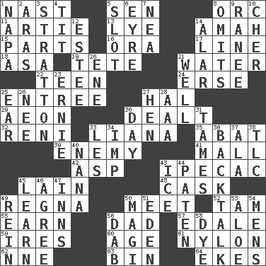 ACROSS 1. Political cartoonist Thomas 5. Elected rep. 8. The grampus (Milton) 11. Nick name for Arthur 13. Potassium hydroxide 14. Housemaid 15. Actors' quests 16. Mouth or opening 17. Actor's bit 18. White ___ sheet 19. Wig 21. Wetness 22. Adolescent 24. Celtic language 25. Main course 27. Actor Linden 29. Age 30. Started a card game 32. Painter Guido (1575-1642) 33. Woody, climbing, usually tropical plant 35. Blind as ____ 39. Foe 41. Shopping center 42. Cleo's killer 43. Medicinal drug used to evoke vomiting 45. (Had) reclined 48. Keg 49. Canadian anthropologist Darnell 50. Rendezvous 52. Scottish cap 55. Merit 56. Male parent 57. Peak District village in England 59. Angers 60. Mature 61. Thermoplastic polyamide 62. Compass dir. 63. Storage container 64. Supplements with great effort DOWN 1. California wine valley 2. Ancient river in northeast Turkey 3. Ski resort town in Vermont 4. Teat (slang) 5. Narrow, elongated depression 6. Jane of fiction 7. Teachers' org. 8. Leaves out 9. Indian princess (variant) 10. "Mermaids" star 12. First name in cosmetics 14. Having or resembling wings 20. Compass dir. 21. Water source 23. Bert's buddy 25. Ewer handle 26. Born 27. Layer 28. American Automobile Association (abbr.) 30. 24 hours 31. Corrects by punishment or discipline 33. French article 34. Naughty child 36. Sass 37. In the manner of 38. Affectionate concern, for short 40. Nanny 43. Frozen water 44. Eucharist need 45. Acquire or gain knowledge or skills 46. Match 47. Restaurants 49. It's straight from the horse's mouth 50. Wise men 51. Genesis locale 53. _ vera 54. Not women's 56. Small moist lump or mass 58. Color