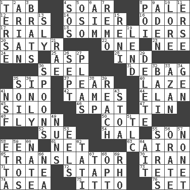 ACROSS 1. Bar bill 4. Fly high 8. Diluted with white 12. Blunders 14. Flexible twig of a willow tree 16. Aroma 17. Monetary unit of Yemen 18. Wine waiters 20. Man with strong sexual desires 22. Single 23. Born 24. Followers of ems 25. Cleo's killer 28. Working for oneself (abbr.) 30. Stitch closed the eyes of (a falcon) 31. Debunk (Brit. slang) 35. Small drink 37. Lightbulb-shaped fruit 40. Goldbrick 41. Words to Nanette 42. Domesticates 44. Liveliness 45. Grain storage tower 46. Argument over a trivial matter 47. Shallow baking pan 48. Film actor Errol 50. ____ d'Azur (French Riviera) 52. Institute legal proceedings 54. Actor Linden 55. Boy, to dad 58. Car or cant ending 61. Fish or hair follower 63. Capital of Egypt 65. Interpreter 70. SW Asia republic 71. Lug 72. Staphylococcus 73. False hair 74. Toward the sea 75. "Tell ____ the Marines!" 76. Put into a specified state DOWN 1. Laconic 2. Believer in; advocate of (suffix) 3. Naughty children 4. Mayday 5. Bear (Spanish) 6. Direct toward a target or goal 7. San ____ (Riviera town) 8. Luau course 9. An important port of Yemen 10. Old wives' tales, e.g. 11. Celtic language 13. Stealthy 15. Painter Guido (1575-1642) 19. Grant temporary use of 21. Actress Charlotte 26. Back-to-school mo. 27. Entreaties 29. Erase 30. Soup utensils 32. Indonesian resort city 33. Muslim summons to prayer 34. Commissioned military rank (abbr.) 35. The visible part of the earth's surface 36. In an inward manner 38. Electrical Unit 39. Arrive at 41. Science/research agcy. 43. Portico 49. Religious women 51. Affectionate concern, for short 53. Snakelike fish 55. Fathers 56. Speak pompously 57. Music written for nine 58. Singer James 59. Greek god of love 60. Nathan's nickname 62. Jacques of French films 64. Small island 66. Teachers' org. 67. Make lace 68. Choose 69. 17th letter of the Greek alphabet