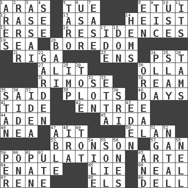 ACROSS 1. Caspian sea tributary 5. Third day of the wk. 8. Needle case 12. To erase 13. White ___ sheet 14. Robbery 15. Celtic language 16. Homes 19. Ocean 20. Mood resulting from idleness 21. Port city in Latvia 23. Followers of ems 24. Pacific Standard Time (abbr.) 27. Came down and settled, as after flight 30. Spanish pot 31. Full of chinks, cracks, or crevices 34. 480, 500 or 516 sheets of paper 35. Alleged 38. Graphs 40. 24-hour periods 41. Event that recurs at intervals 42. Main course 44. Arabian gulf 45. Opera by Verdi 46. Teachers' org. 47. Small island 50. Flair 53. "Death Wish" actor 57. Separate the seeds from cotton 59. Census information 63. Johnson of "Laugh-In" 64. Maternal 65. Falsehood 66. Be tempered by heat 67. French philosopher Descartes 68. Raised railways 69. Small valley DOWN 1. Ancient Greek god of war 2. More valued for its uncommonness 3. Slender Brazilian palm 4. Perceive with the eye 5. Edible starchy tuberous root 6. One who uses or employs something 7. Comfort 8. Car or cant ending 9. Nervous spasm 10. Purpose 11. ___ a Wonderful Life 14. Folds over and sews together 17. Binary compound 18. Spanish title 20. Indonesian resort city 22. Place where plants grow 24. Entreaty 25. Kill 26. Scottish caps 28. Naughty child 29. Lacquered or enameled metalware 30. Severe or trying experience 32. Male child 33. Singer James 35. Comedian Laurel of Laurel & Hardy 36. Assistant 37. The main thing one is thinking about 39. Indian title of respect (Mr.) 43. Locale of original sin 47. Competent 48. Lyricist Gershwin 49. Small child 51. Match 52. Relating to or accompanying birth 54. "Death on the ____" 55. Earth 56. Washington bills 58. 1994 drama film starring Jodie Foster 59. For each 60. Single 61. Baking dish 62. Shoshoni 63. Added to