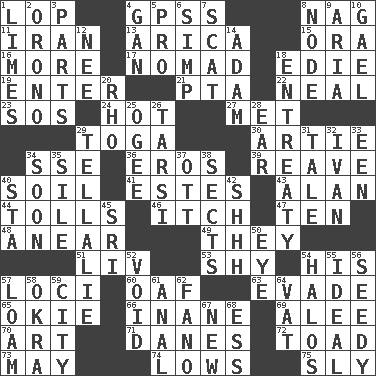 ACROSS 1. Trim (branches) 4. Global Positioning Systems (abbr.) 8. Tired old horse 11. SW Asia republic 13. N. Chile seaport 15. Mouth or opening 16. Greater amount 17. Roamer 18. Singer Brickell 19. Keyboard key 21. Parent Teacher Association (abbr.) 22. Anneal 23. Mayday 24. Being at a high temperature 27. Was introduced to 29. Ancient Roman robe 30. Nick name for Arthur 34. Compass dir. 36. Greek god of love 39. Rob, plunder, or pillage 40. The visible part of the earth's surface 41. _____ Park, CO 43. Actor Alda or Thicke 44. For Whom the Bell _____ 46. Hankering 47. "___ Little Indians" 48. Approach 49. Those things 51. 54 in ancient Rome 53. Like a shrinking violet 54. Part of HMS, perhaps 57. Locales 60. Clumsy lout 63. Elude 65. Migrant worker of the '30s 66. Lacking in sense or substance 69. Toward shelter 70. Tate display 71. Natives or inhabitants of Denmark 72. Frog relative 73. Can I? 74. Moos 75. Playfully artful DOWN 1. Citrus fruits 2. U. of Maine site 3. Actors' quests 4. Separate the seeds from cotton 5. Adept person 6. Simple or foolish person 7. Get outta here! 8. Thickened enlargement 9. Operatic vocal solo 10. Highlander 12. Born 14. First of billions? 18. Plea 20. 17th letter of the Greek alphabet 25. Double curve, resembling the letter S 26. Tarsus (plural) 28. Hearing organ 29. Copy Pinocchio 31. Story 32. _ the terrible 33. Car or cant ending 34. Within a short period 35. Drop; flow; fall 37. Baseball player Mel 38. Religious groups 40. R.R. building 42. Quiet! 45. Indian title of respect (Mr.) 50. Sight organ 52. Empty area or space 54. Saint headwear 55. Standard of perfection 56. Shabby and untidy 57. Rich soil 58. Gumbo ingredient 59. Municipality 61. Of or related to the anus 62. Papal veil 64. Large container 67. ___ Haven, CT 68. Double-curved letter