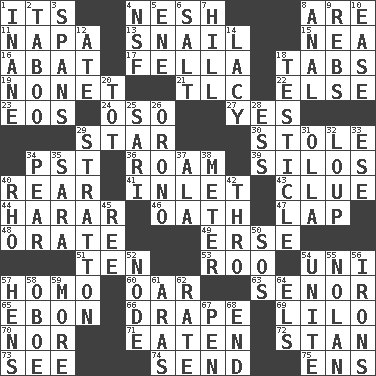 ACROSS 1. ___ a Wonderful Life 4. Soft 8. "We ___ not amused" (Victoria) 11. California wine valley 13. Slow-paced one 15. Teachers' org. 16. Blind as ____ 17. Chap (slang) 18. Bar bills 19. Music written for nine 21. Affectionate concern, for short 22. Otherwise 23. Greek goddess of the dawn 24. Bear (Spanish) 27. It is so 29. Play the lead 30. Fur scarf 34. Pacific Standard Time (abbr.) 36. Wander 39. Grain storage towers 40. Located in or toward the back 41. An arm off of a larger body of water 43. A slight indication 44. Ethiopian city, capital of Harari 46. Pledge 47. Infant locale 48. Speak pompously 49. Celtic language 51. "___ Little Indians" 53. Friend of Pooh 54. Corn or form start 57. Same (prefix) 60. Boat paddle 63. Sir (Sp.) 65. Inky black, to poets 66. Window treatment 69. _ and Stitch 70. Or not 71. Consumed 72. Comedian Laurel of Laurel & Hardy 73. Perceive with the eye 74. Post 75. Followers of ems DOWN 1. Silly 2. Off limits 3. Connects, as a bridge 4. Overdraft (abbr.) 5. Compass dir. 6. Table seasoning 7. Land elevation 8. Of or related to the anus 9. Confederate soldiers (slang) 10. Relaxation 12. Had dinner 14. Made of lace 18. A testis 20. Small child 25. Indian skirt 26. U. of Maine site 28. Double-curved letter 29. Ski resort town in Vermont 31. Spanish pot 32. Central Nebraska county 33. Compass dir. 34. Lightbulb-shaped fruit 35. "Two Mules for Sister ____" 37. According to 38. Distance measurement 40. 17th letter of the Greek alphabet 42. Through, poetically 45. To sift 50. Mayday 52. Connecting point 54. Join together 55. Pitcher Ryan 56. Removes the wrinkles 57. Coop moms 58. Mitch Miller's instrument 59. Greater amount 61. Ancient river in northeast Turkey 62. Pace 64. Raised railways 67. Animal enclosure 68. Conclude
