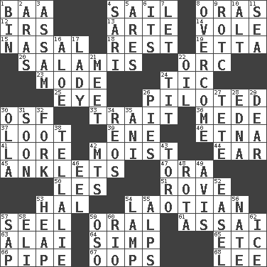 ACROSS 1. Sound made by sheep 4. Move on water 8. Mouths or openings 12. Big collection agency 13. Johnson of "Laugh-In" 14. Short-tailed, large-bodied rat 15. Rhinal 18. Respite 19. Singer James 20. Deli grouping 22. The grampus (Milton) 23. Method 24. Nervous spasm 25. Sight organ 26. Manned the helm 30. Order of Saint Francis (abbr.) 33. Distinguishing feature 36. Ancient Persian 37. Spoils 39. Compass dir. 40. Inactive volcano in Sicily 41. Old wives' tales, e.g. 42. Wet 44. Hearing organ 45. Short socks 47. Mouth or opening 50. French article 51. Be footloose 53. Actor Linden 54. Of or relating to Laos or its people 57. Stitch closed the eyes of (a falcon) 59. Taken by mouth 61. Slender Brazilian palm 63. Jai _ 64. Simple or foolish person 65. And so on (abbr.) 66. Corncob 67. I made a mistake 68. Area sheltered from the wind DOWN 1. Storage container 2. Caspian sea tributary 3. Indian state 4. Indian skirt 5. Ancient Greek god of war 6. It is 7. Allow 8. Conquer 9. College mil. group 10. The first octave above the treble staff 11. Ocean 16. Medicinal plant 17. Kenny Rogers chart-topper in '80 21. Confront 22. Petroleum 24. Teat (slang) 26. Sliced desserts 27. Wig 28. Pulitzer Prize-winning author Ferber 29. Letter starter 30. Water jar 31. Within a short period 32. Tined utensil 34. Vintage cars 35. Black tropical American cuckoo 38. Copy Pinocchio 42. Mountains (abbr.) 43. "Corrida" creature 46. Snakelike fish 48. Roll call or roster of names 49. Opinion 52. Artist's stand 53. Pile 54. Desk light 55. High mountains 56. Nathan's nickname 57. Plant excrement 58. Connecticut Ivy Leaguer 59. Bear (Spanish) 60. _ de Janeiro 62. Frozen water
