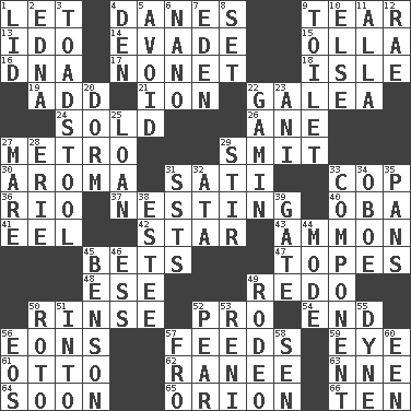 ACROSS 1. Allow 4. Natives or inhabitants of Denmark 9. Pull apart 13. Wedding promise 14. Elude 15. Spanish pot 16. Heredity factor (abbr.) 17. Music written for nine 18. Small island 19. Find the sum of 21. Electrically charged atom 22. An organ shaped like a helmet 24. Disposed of to a purchaser 26. A saturated hydrocarbon 27. Paris' subway 29. Stricken, poetically 30. Scent 31. Suttee (variant) 33. Police officer (slang) 36. _ de Janeiro 37. Nestling 40. Chief or king in Benin or Nigeria 41. Snakelike fish 42. Play the lead 43. ID or VA city 45. Stakes 47. Drinks excessively 48. Compass dir. 49. Redecorate 50. Wash lightly 52. Adept person 54. Conclusion 56. Immeasurably long periods of time 57. Gives food to 59. Sight organ 61. "Beetle Bailey" pooch 62. Indian princess (variant) 63. Compass dir. 64. Within a short period 65. Greek mythologigal hunter 66. Nine, plus one DOWN 1. Flaplike covering 2. Pulitzer Prize-winning author Ferber 3. Inedible or poisonous agaric 4. Lair 5. Shun 6. Billionth: prefix 7. Locale of original sin 8. Arrange properly for use 9. Bathroom 10. Otherwise 11. Silent film actress Nazimova 12. Actress Charlotte 20. Dormintory (informal) 22. Homeless child 23. Black tropical American cuckoo 25. Grant temporary use of 27. Female horse 28. One of the Great Lakes 29. Move through with a circular motion 31. Fast planes 32. "One Day ___ Time" 33. Piece 34. Mitch Miller's instrument 35. Baking dishes 38. First name in cosmetics 39. Yard entry 44. Method 45. Gillaume's butler role 46. Double-curved letter 49. Cowboy competition 50. Printing process, for short 51. To the inside or interior of 52. Lightbulb-shaped fruit 53. Painter Guido (1575-1642) 55. Unit of force 56. Greek goddess of the dawn 57. From 58. Elected rep. 60. Car or cant ending