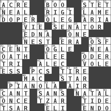 ACROSS 1. Measure of real estate 5. Oct. 31 cry 8. Proofreading order 12. Anneal 13. Swiss mountan, "Queen of the Mountains" 15. Unable to walk 16. Drug addict 18. Cassini of fashion 19. Roberta Peters solo 20. Compete 22. Legislator 24. Pulitzer Prize-winning author Ferber 26. Single 27. A home for chicks 28. Period 29. Order of Saint Francis (abbr.) 32. Penny 35. Stare 37. Teachers' org. 38. Pledge 39. Area sheltered from the wind 40. River in Europe 41. Three (prefix) 42. Actor Baldwin 43. Short-tailed, large-bodied rat 44. Double-curved letter 45. Personal Computers (abbr.) 46. Hoop that covers a wheel 49. Apple computer (short form) 50. Play the lead 51. Player piano 55. Atmosphere 56. Patter 57. Without 59. Relating to or accompanying birth 63. Single time 64. Russian ruler 65. Periodic rise and fall of the sea level 66. Russian ruler of old 67. Connecticut Ivy Leaguer 68. Inside; within (prefix) DOWN 1. Plus 2. Corporate head (abbr.) 3. Reproach for some lapse or misdeed 4. Veterans Day date 5. Sis' sibling 6. Petroleums 7. Double curve, resembling the letter S 8. Chalkboard 9. Edible starchy tuberous root 10. Arab leader 11. Beverage made from leaves 14. Snub 17. Travel on or in a vehicle 21. Followers of ems 23. Santa ___, CA 25. Ringlike coral islands and reefs 28. Chooses 29. Southwest Nigerian state 30. Sew up the eyelids of hawks and falcons 31. Conductor's collection 32. ____ d'Azur (French Riviera) 33. Hearing organs 34. Nuclear Threat Initiatives 36. Unit of force equal to gravity 40. Make much ado about nothing 42. Buttonhole 45. Baking dish 47. Call ___ day 48. Water falling in drops from the sky 49. Mother 51. Zero-star reviews 52. South American Indian 53. Goldbrick 54. Of or related to the anus 56. Small bed 58. Indian title of respect (Mr.) 60. Shallow baking pan 61. Say or write further 62. Lion