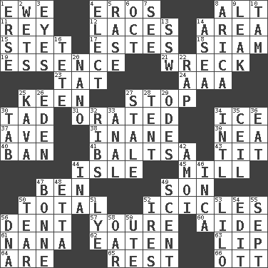 ACROSS 1. She-sheep 4. Greek god of love 8. The first octave above the treble staff 11. Marina Del _, California 12. Shoestrings 14. Length times width 15. Proofreading order 17. _____ Park, CO 18. Thailand, formerly 19. Substance 21. Raze 23. Make lace 24. American Automobile Association (abbr.) 25. Peachy ____! 27. Constrict 30. Small amount or degree 31. Spoke pompously 34. Frozen water 37. "___ Maria" 38. Silly 39. Teachers' org. 40. Bar 41. Greek mezzo-soprano Agnes 43. Teat (slang) 44. Small island 45. Place where flour is made 47. Benjamin's nick name 49. Male offspring 50. Add up to 52. Winter's stalactites 56. Scratch 57. You are 60. Assistant 61. Grandmother 62. Eroded 63. Mouth edge 64. "We ___ not amused" (Victoria) 65. Remainder 66. Baseball player Mel DOWN 1. Celtic language 2. Soaks 3. Snake ____ (dice throw) 4. Opt 5. To erase 6. Sep. follower 7. Observe 8. N. Chile seaport 9. Path through which fluid escapes 10. Scottish cap 13. Compass dir. 14. Toward the sea 16. Wig 20. Billionth: prefix 22. Hit sharply and swiftly 25. Polynesian shrub of the pepper family 26. Paradise 27. Lacking originality or spontaneity 28. Portable shelter 29. Lyric poems 30. Keyboard key 32. Teases 33. Of or related to the anus 34. International (abbr.) 35. To provide with a ceiling 36. Consume 42. Mine, in Marseilles 44. _ tizzy (2 wds.) 46. South American Indian 47. Maid-servant 48. Singer James 49. Odor 50. Rend 51. Potassium hydroxide 52. Angers 53. _ and Stitch 54. Prepare for publication 55. Back-to-school mo. 56. Heredity factor (abbr.) 58. Rowing implement 59. Shoshoni